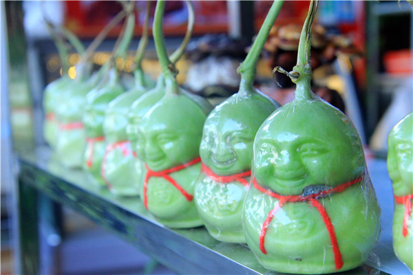 这位农妇在英德一景区内卖水果,货架上摆出来的香瓜都是娃娃状。香瓜不是很大,每个约13厘米高,最宽直径8厘米左右,形状大小差不多,外表通身碧绿。整个瓜的形状就像“娃娃”,头部由一根藤连接着,五官俱全,清晰的眉毛,微微眯着的双眼,小嘴唇呈笑容状,胖嘟嘟的脸蛋,亦如一尊露出憨厚笑脸的大佛。