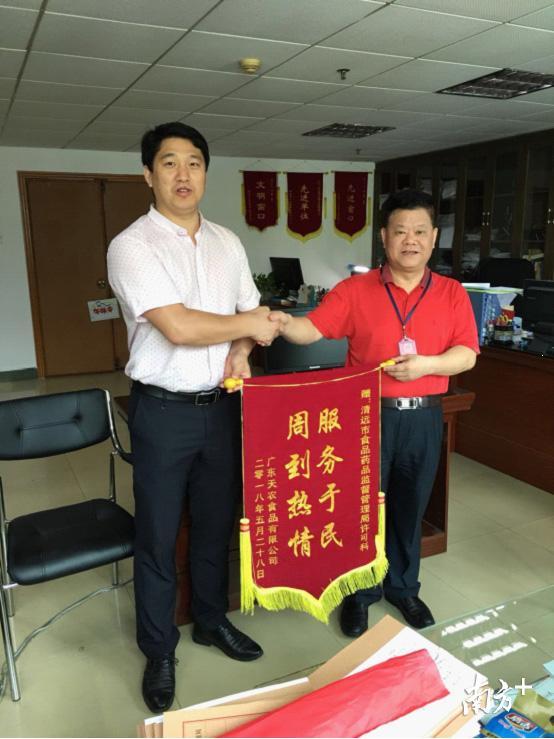 19日,记者从清远市食品药品监管局获悉,广东华饮食品供应链管理有限公司企业负责人罗观清将一面印有“务实高效 服务周到”的锦旗,送到了清远市食品药品监管局窗口,对工作人员的高效、热情服务致以感谢。