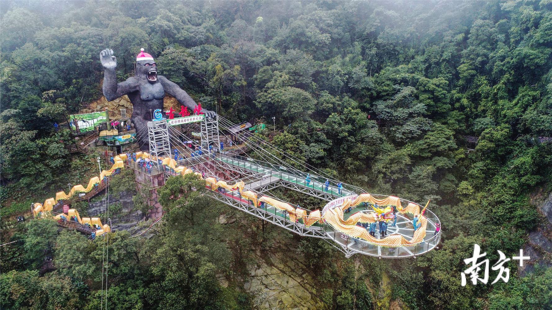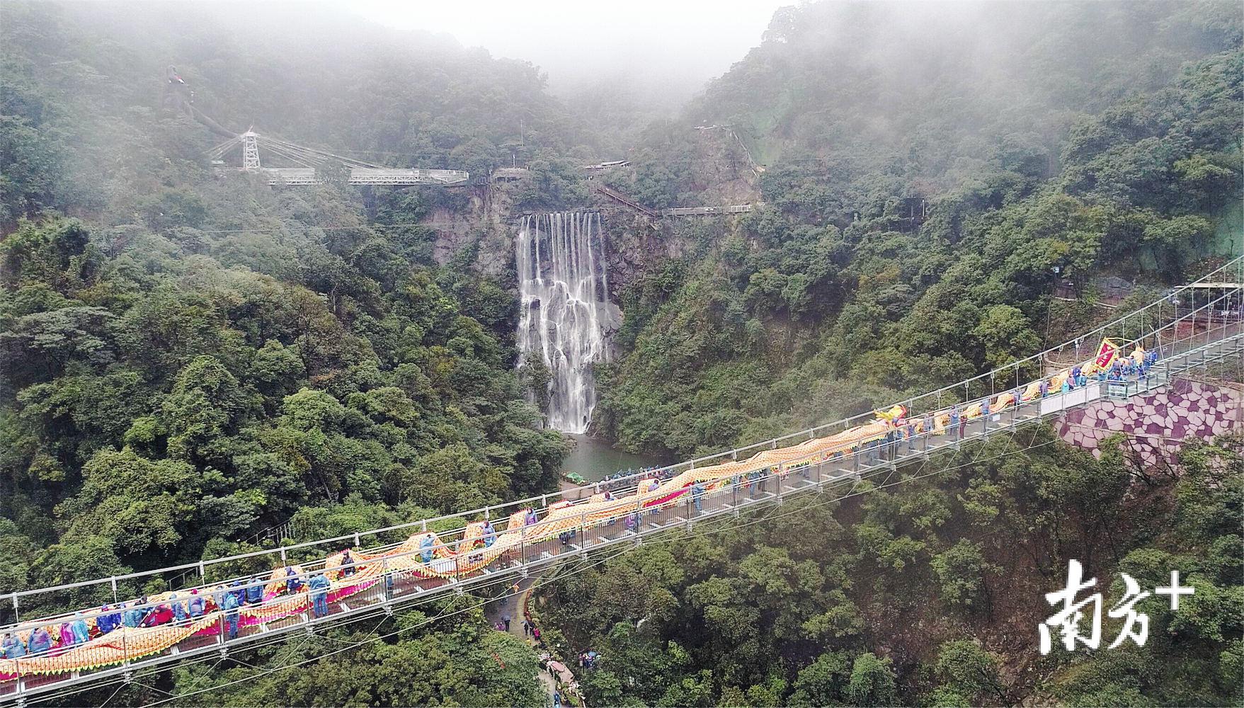 据悉,来自珠玑古巷的舞龙长699米,龙身直径2米,重500多公斤,仅龙头就重达40公斤,需要200多人才能舞起,如果算上替换队员、鼓乐手的话,整个舞龙队的队员数量将超过300人。巨龙在清远古龙峡创造世界纪录的玻璃桥上成功舞动,也成为了千年等一回的“双龙会”。