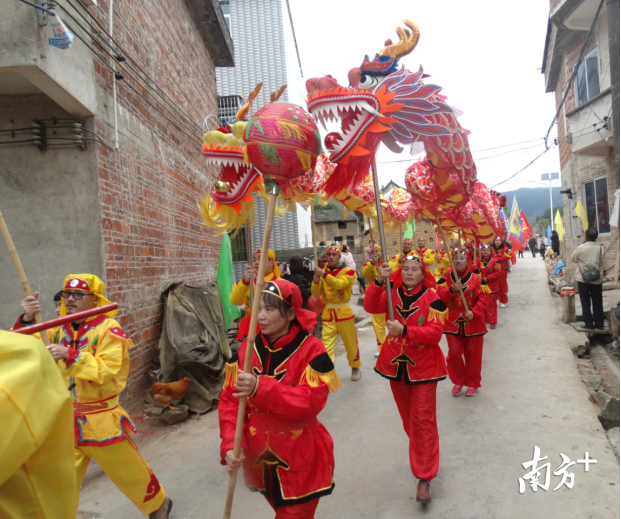 巡游中,一路鼓声震耳欲聋,沿途经过的住宅燃放鞭炮迎合巡游队伍。艺术巡游队伍浩浩荡荡环村公路巡游一圈,回到礼堂门口广场后,举行舞狮舞龙和唱春牛等文艺表演。