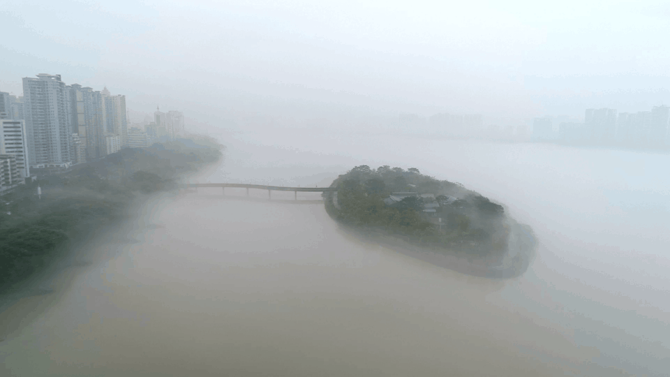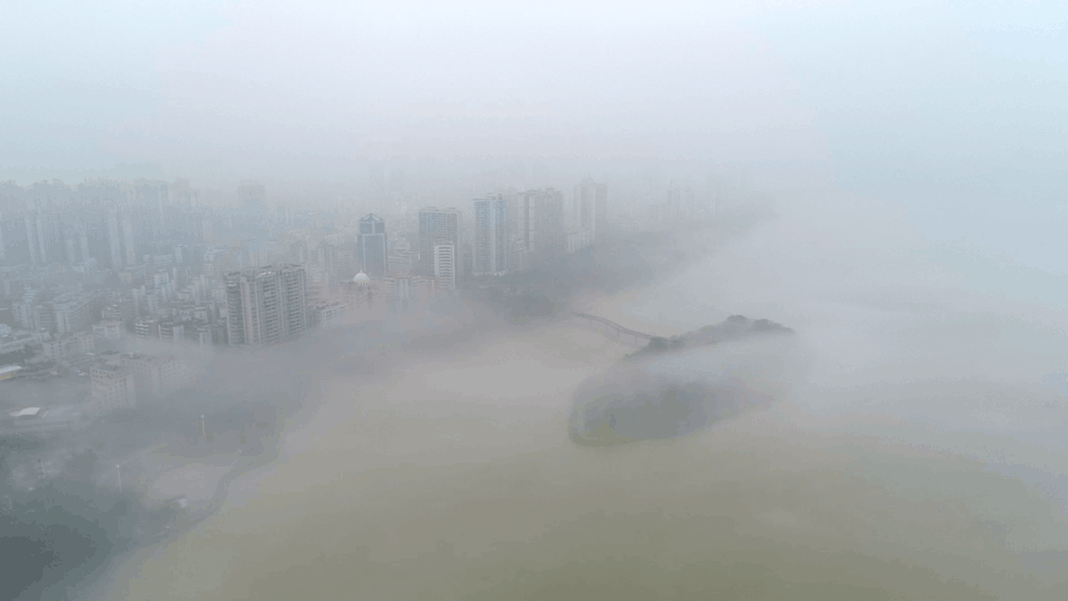 3月5日下午,经过白天雨的洗礼,市区湿气加重,雾气慢慢升起……俯瞰整个清城区云蒸霞蔚,影影绰绰,北江的水与雨雾相遇,清远瞬间像极了一座在云海中架起的城市。