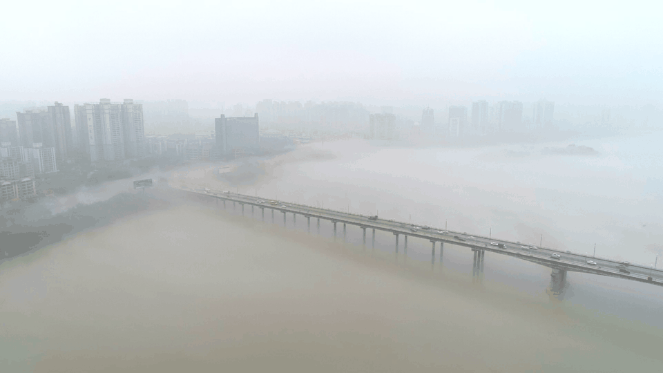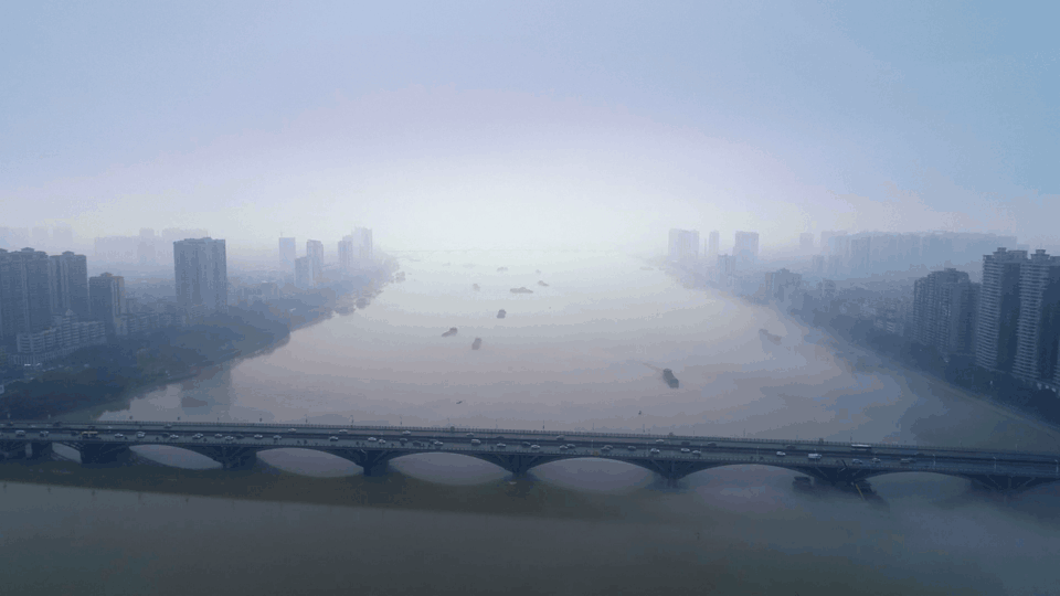 远眺雨雾环绕下的北江大桥,横跨在淡淡的水面上,高楼真由近及远地在雾气中逐渐淡去颜色,远处几艘航船宛如在云海中缓缓航行。
