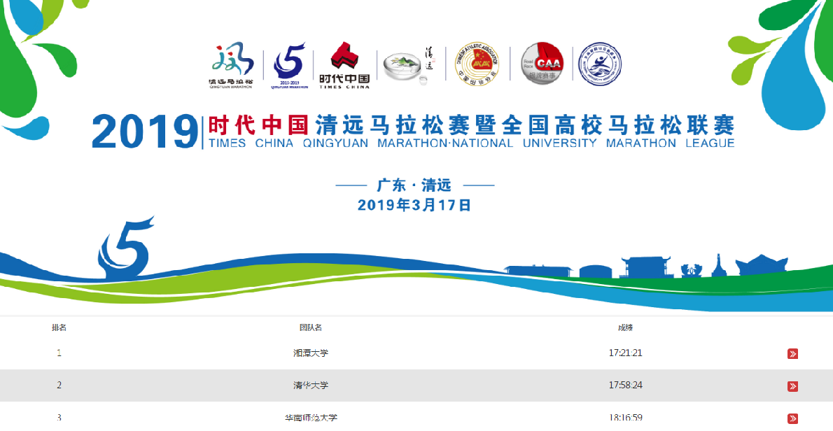 本届清马第二次同步举办全国高校马拉松联赛,吸引了北京大学、清华大学等国内41所高校参赛,近千名高校师生、校友跑进凤城,助力清远人才战略,领跑清远发展未来。最终来自湘潭大学的林鑫以2小时33分02秒的成绩夺得全程马拉松高校男子组冠军,来自华南师范大学的汪志明获得亚军,来自广东财经大学的巴贤伟获季军。全程高校女子组方面,来自湘潭大学的张妮以2小时59分56秒成绩夺冠,来自吉林大学的田园获亚军,来自桂林理工大学的梁少艳获季军。团体奖前三名分别由:湘潭大学、清华大学、华南师范大学获得。