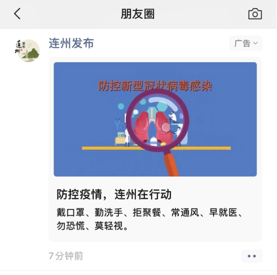 针对本次疫情防控工作,连州市委宣传部从1月29日起,对连州属地范围内的市民群众的微信朋友圈投放“疫情防控宣传广告”,投放总量为50万条,基本覆盖全市微信用户。