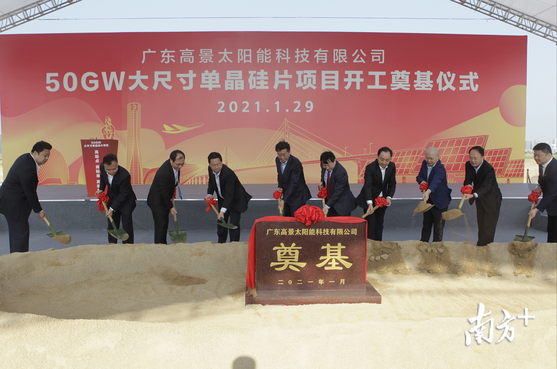 1月29日,总投资约170亿元的广东高景太阳能科技有限公司(简称“高景太阳能科技”)50GW大尺寸单晶硅片项目在珠海市金湾区开工奠基。珠海培育千亿级新能源产业集群迈出重要一步。珠海市委书记郭永航、市长姚奕生出席仪式。