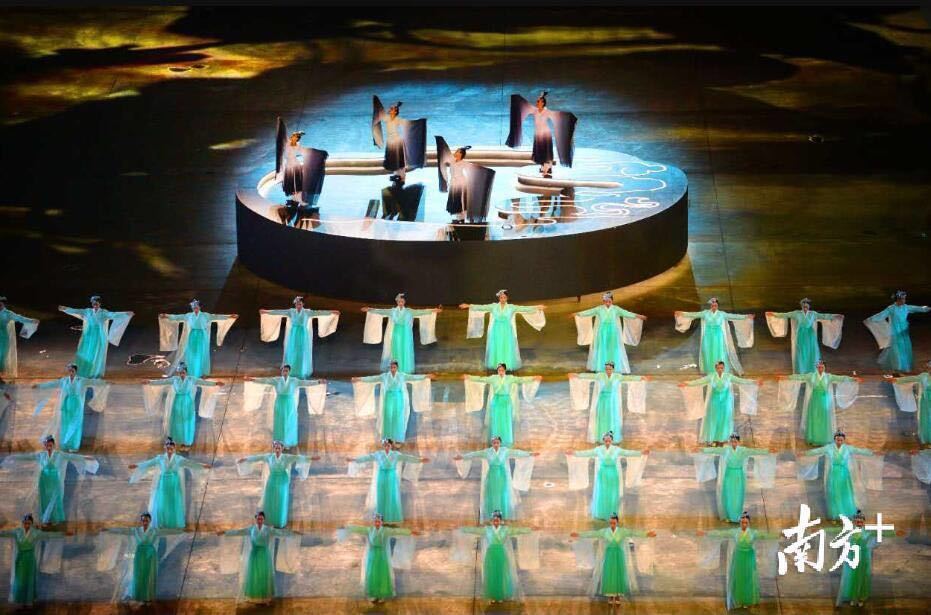 当背景投影画面变化时,场内演员们也随之变换着动作和队形,双方共同作用,讲述了从远古广府文化再到当代美丽宜居现代都市的古今传承,从而展现出肇庆作为广府文化发源地、海上丝路和陆路丝路连接点、粤港澳大湾区面向大西南枢纽门户城市的独特魅力。