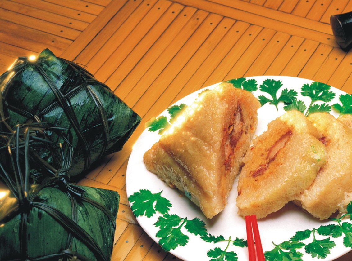 鼎湖山裹蒸粽用本地特有的冬叶包裹、水草包扎,呈枕头状或埃及金字塔形。馅料由糯米、绿豆等素料制成,内藏的肥肉更肥美适中,调和味道,深受大众喜爱,它更体现了肇庆裹蒸的传统风味和裹蒸文化。