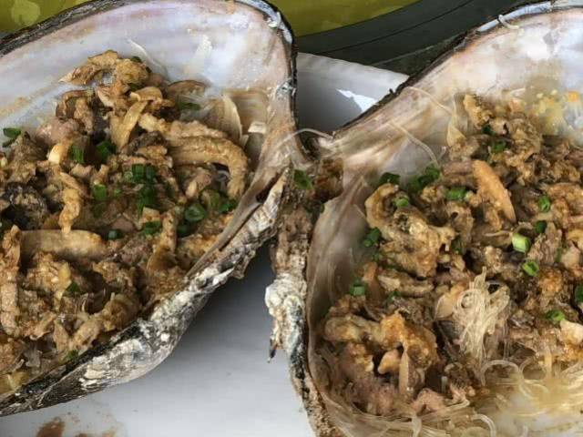 西江的野生河蚌比成人的手掌还要大些许,一个大河蚌要用两只手才能捧起来。墨绿色的蚌壳,内部颜色光亮,内含着“珍珠”肉,配以蒜蓉粉丝蒸的做法,着实将河蚌的鲜甜之味调了个十足,开发了河蚌的独特味道。