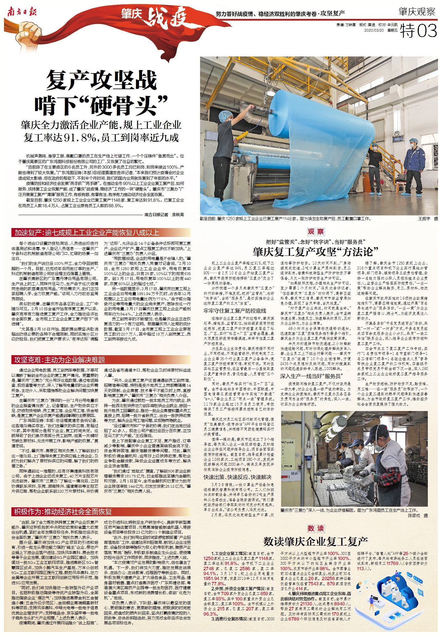 规上工业企业复产率超过91%,规下工业企业复产率达94%,员工复工率超过90%……自2月10日企业开始复工复产以来,肇庆市疫情防控指挥部“三复办”交出了一份亮眼的答卷。