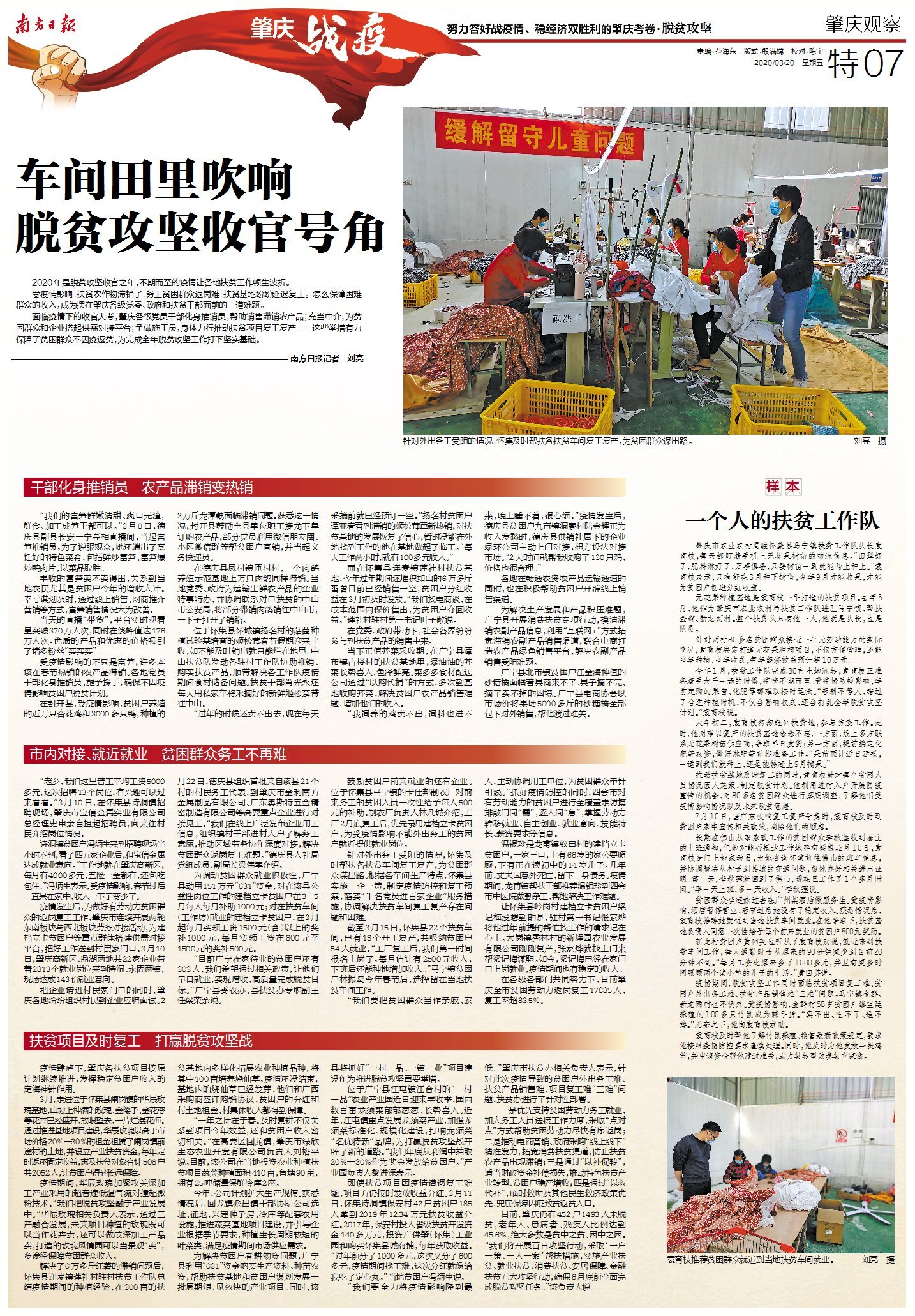 面临疫情下的收官大考,肇庆各级党员干部化身推销员,帮助销售滞销农产品;充当中介,为贫困群众和企业搭起供需对接平台;争做施工员,身体力行推动扶贫项目复工复产……这些举措有力保障了贫困群众不因疫返贫,为完成全年脱贫攻坚工作打下坚实基础。