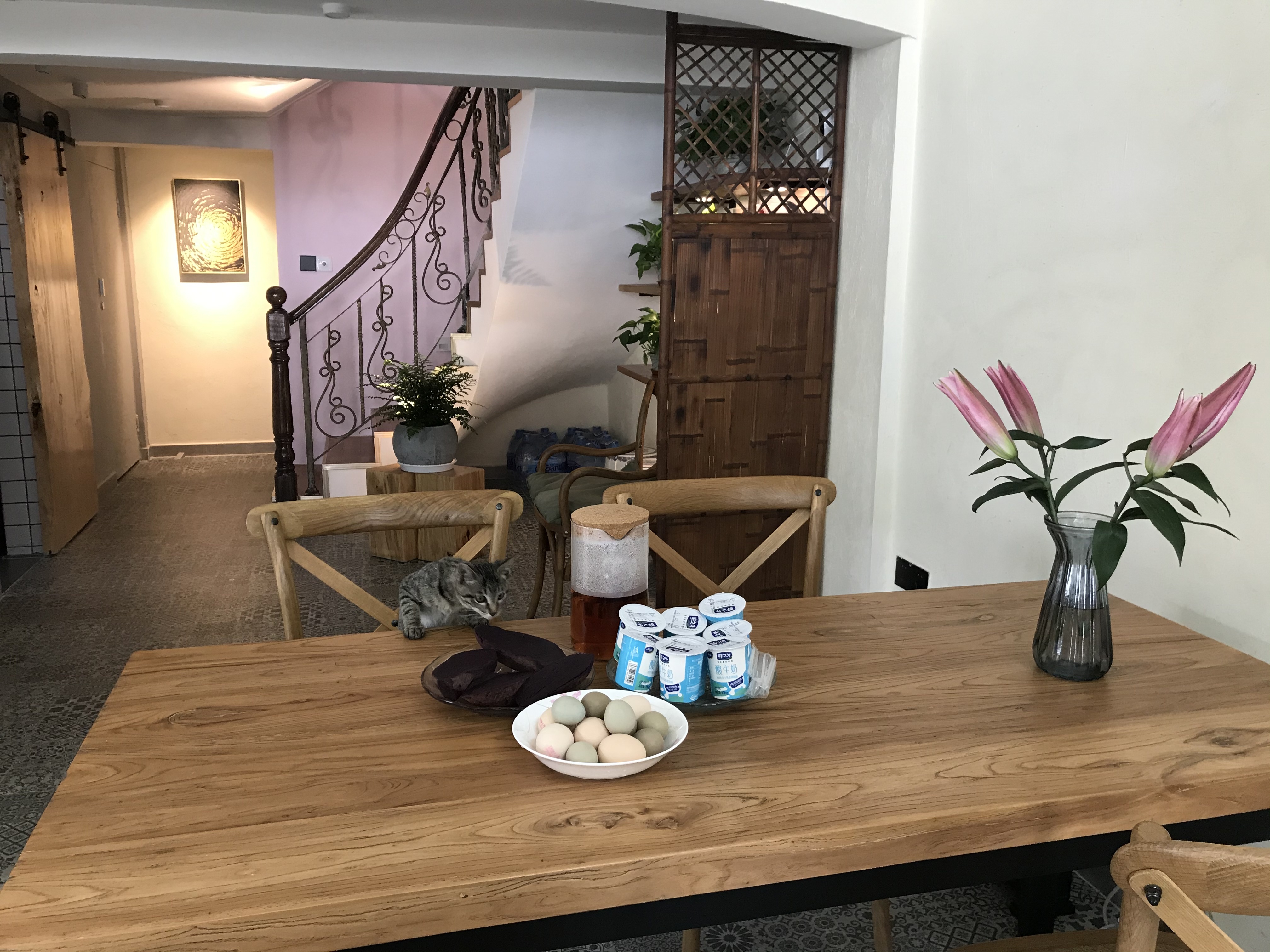 沿着岩前那片湖一直往前走,拐过几个弯就能看到尺渡民宿的招牌。推门而入,素净的花草和一些多肉盆栽映入眼帘,一只三个月大的猫仰着头好奇地瞅着来客。