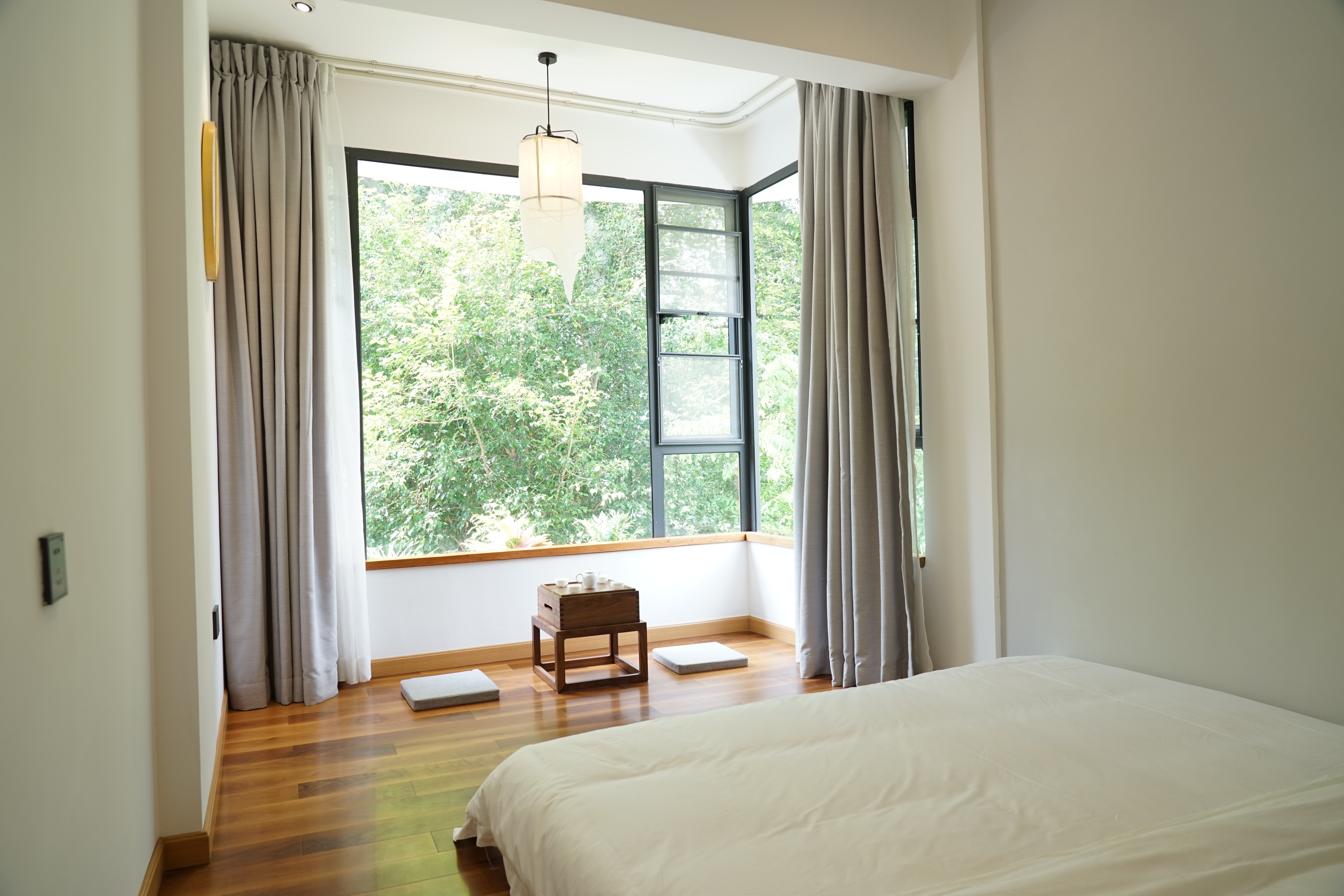 尺渡每个房间都有榻榻米的设计,墙面材料采用了暖色调的紫金灰,一根根稻草镶嵌在墙体里。拉开白色窗帘,就能看到郁郁葱葱的树木围抱着房间,既有一定的安全距离,又感觉伸手就能摸到枝叶。“客人住在这里好似睡在树中。”梁婉君力求把纯粹的、天然的设计渗到民宿的细节处,从而为客人搭建起一个独立的空间,制造一种温暖、放松的氛围。
