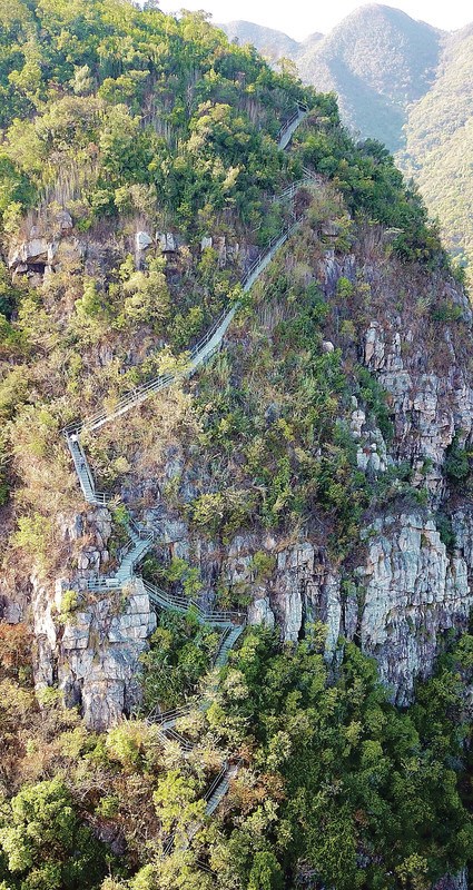 毫无疑问,在肇庆众多公园当中,这座公园最具挑战性。它有A、B、C三条徒步线路,其中C线最为险峻,该线地形陡峭,登到最高处海拔800多米,适合体魄优秀的登山高手挑战。其中,C线当中又数“将军帽”的位置最惊险,从空看中,上山的阶梯像一条天梯,几乎垂直“挂”在山峰崖壁之上,不但让攀爬者心惊,观望者也不禁吸了一口凉气。