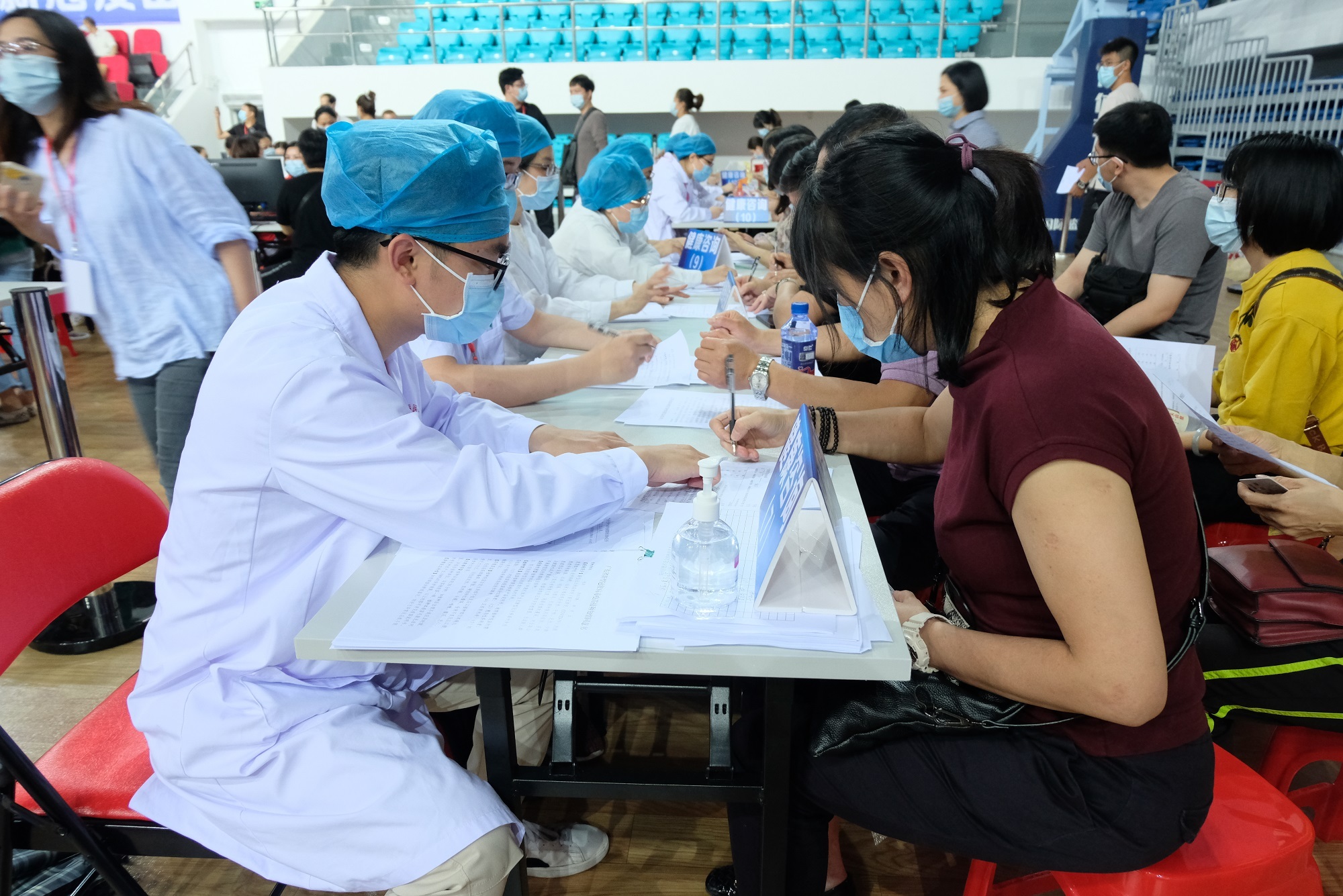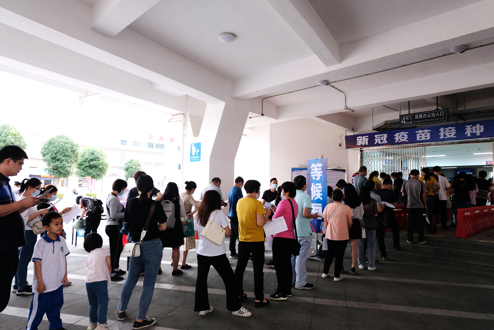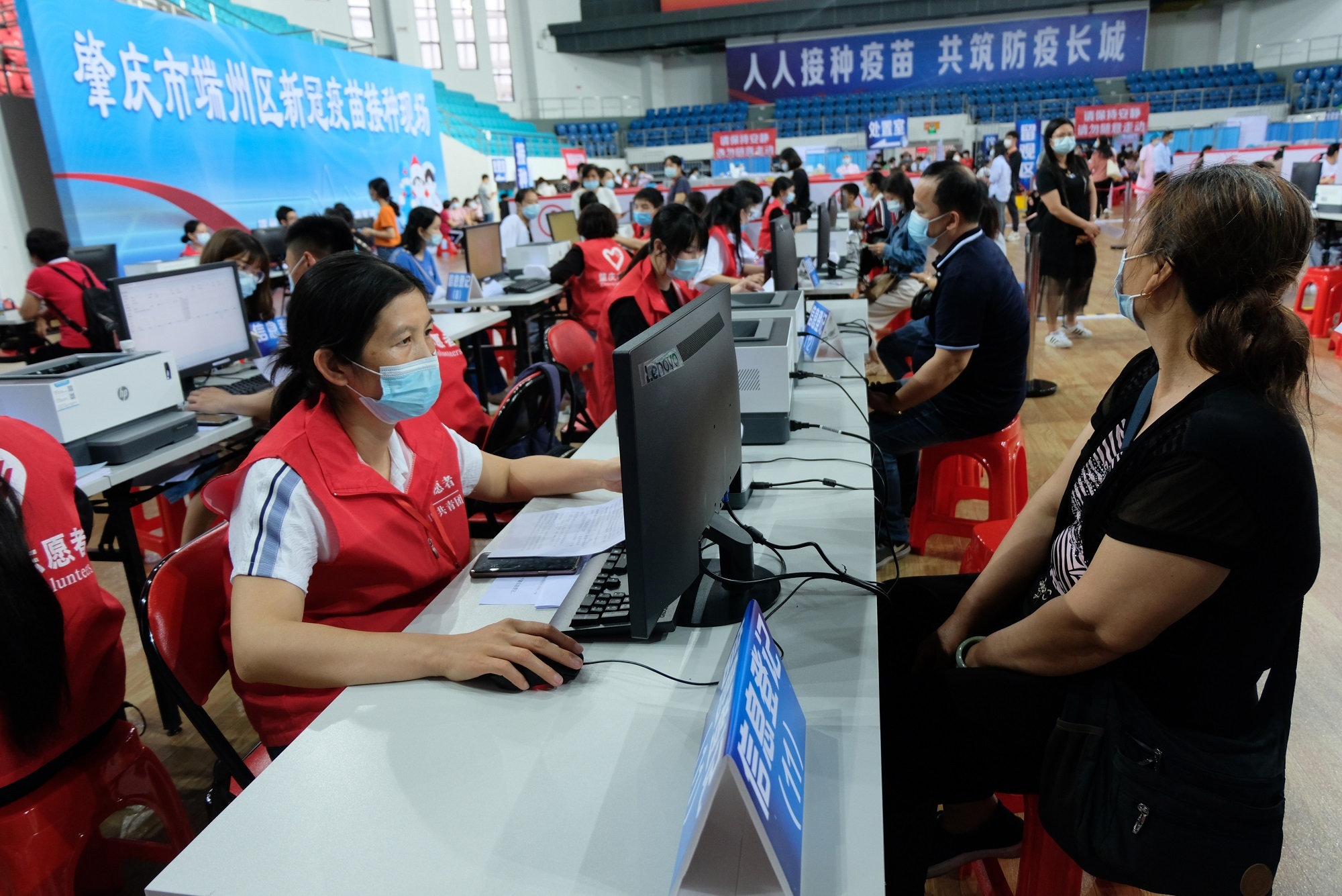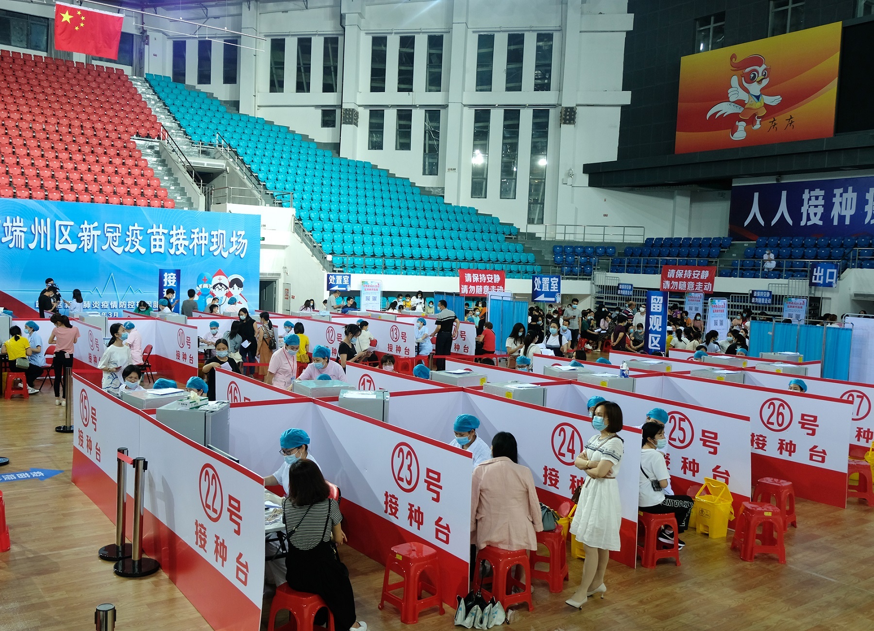 肇庆市体育中心接种点共150多名工作人员为市民提供新冠病毒疫苗接种服务,现场设等候区、咨询区、信息登记区、疫苗接种区、休息留观区等区域。