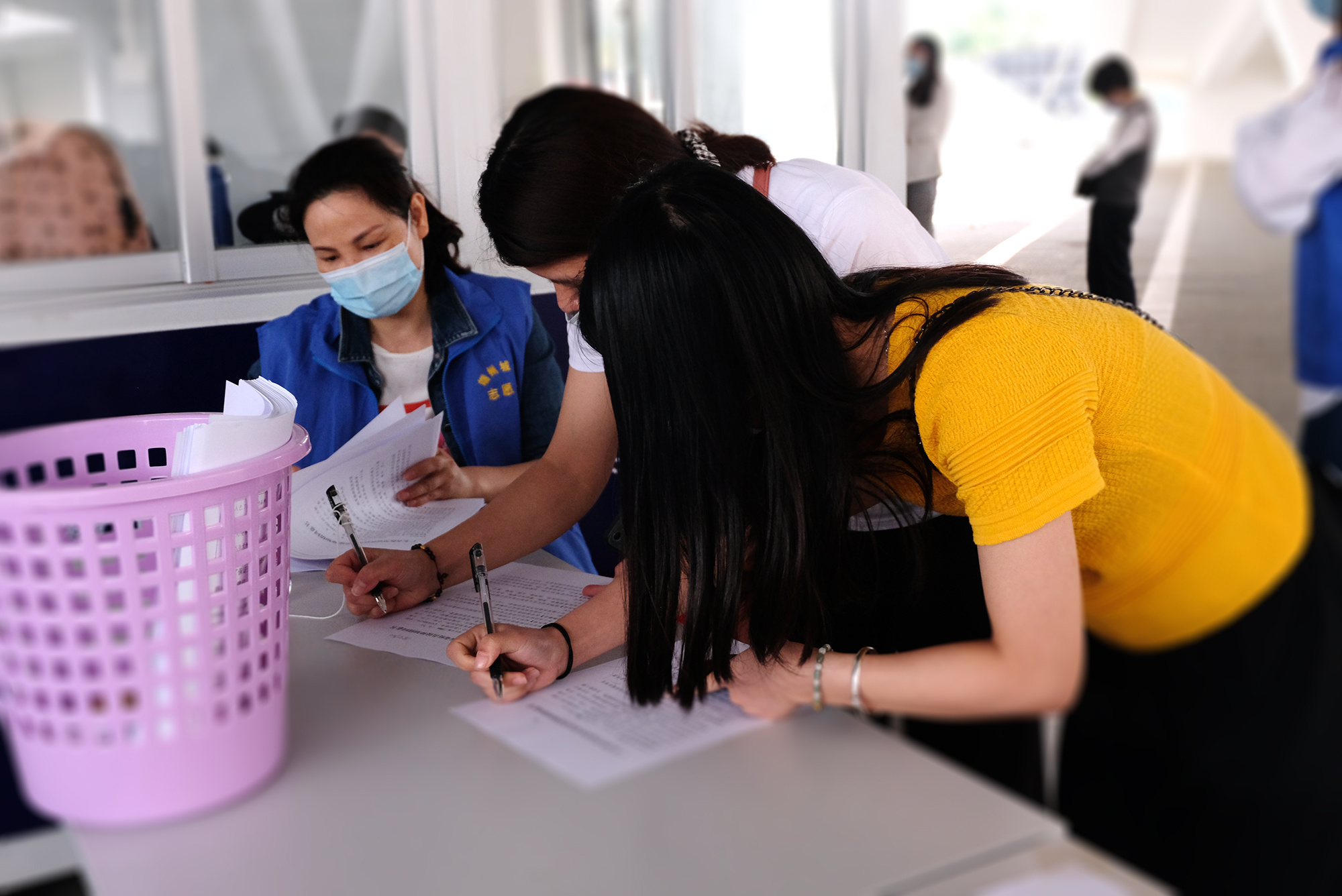 市民在志愿者的提醒帮助下,填写“广东省新型冠状病毒疫苗接种知情同意书”。