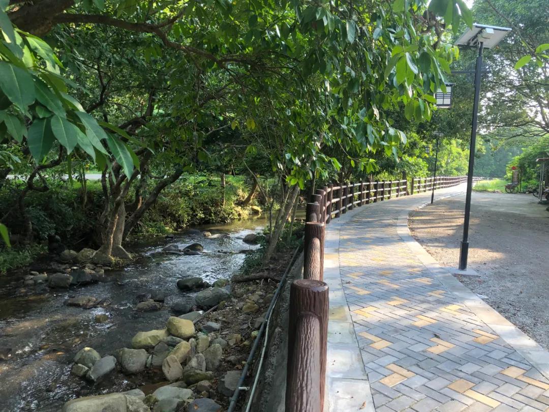 龙溪栈道新延长线总长560m,紧贴龙溪往坑尾村方向延伸,设有2座六角亭和1座拱桥,配备公共卫生间、凉亭、石凳、消防器材等配套设施。项目对原有水渠和部分较高挡土墙进行了改造,使沿路更加开阔平整。路面铺设仿古青砖、配上仿树木艺术护栏,既美观又安全。