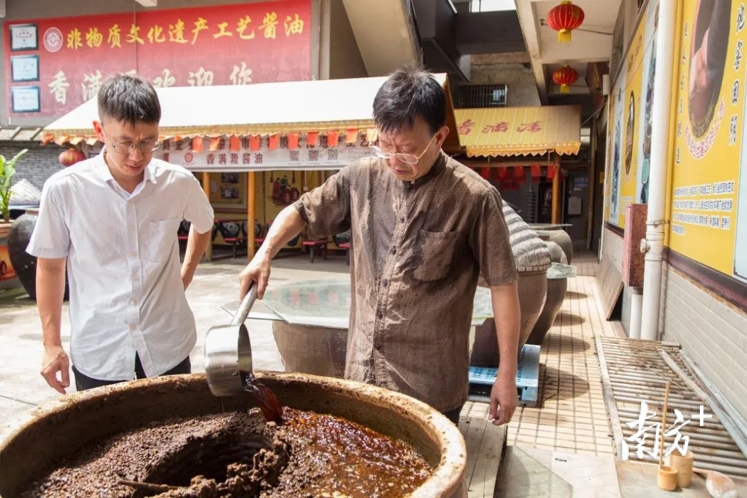 梁悦明是肇庆市级非遗代表性传承人,他在秉承传统高盐稀态常温发酵酿造工艺的基础上,深入挖掘、研究梁氏先辈酱油酿造经验,总结出“回窖陈酿”的独特工艺,有效提高酱油的品质而且口味更佳。