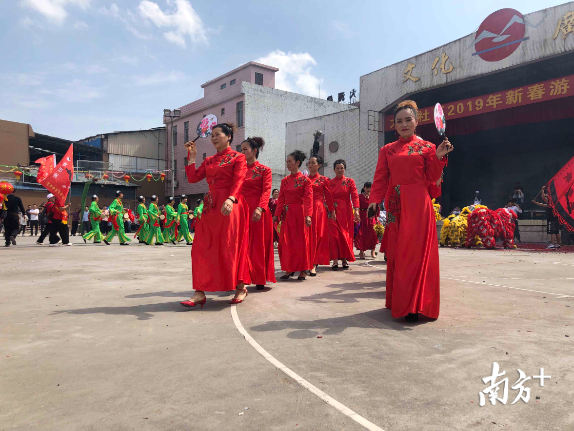 当天下午1时,巡游队伍整齐地在大洲社区广场集中,鞭炮一响,巡游正式开始,排在前头的醒狮、麒麟队伍开始舞动起来,从广场出发绕全社区转一圈。醒狮队、麒麟队、锣鼓队、妇女队、学生队等组成的巡游队伍,绵延数公里,浩浩荡荡,蔚为壮观,宛如一条巨大的彩龙,沿着该社区的主要街道走街串巷,沿路上醒狮飞舞、锣鼓齐鸣,所经之处均是一片沸腾,家家户户的村民都在门口燃放鞭炮喜迎巡游队伍的到来。