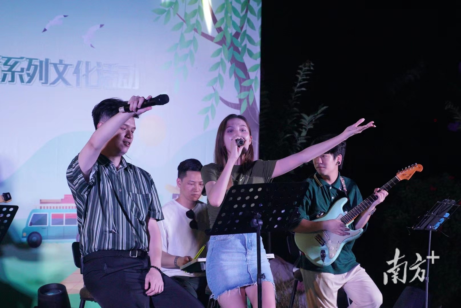 启动仪式过后,“火柴盒”城市艺术TIME热情开演,特别邀请了东莞本土优秀音乐团队Vincent乐队,以人声多重唱结合器乐伴奏,为现场群众带来了《日不落》《园游会》等多首经典歌曲,极具特色的舞台表演形式吸引台下无数观众激情合唱,在歌声中感受荷风营趣与青春气息。