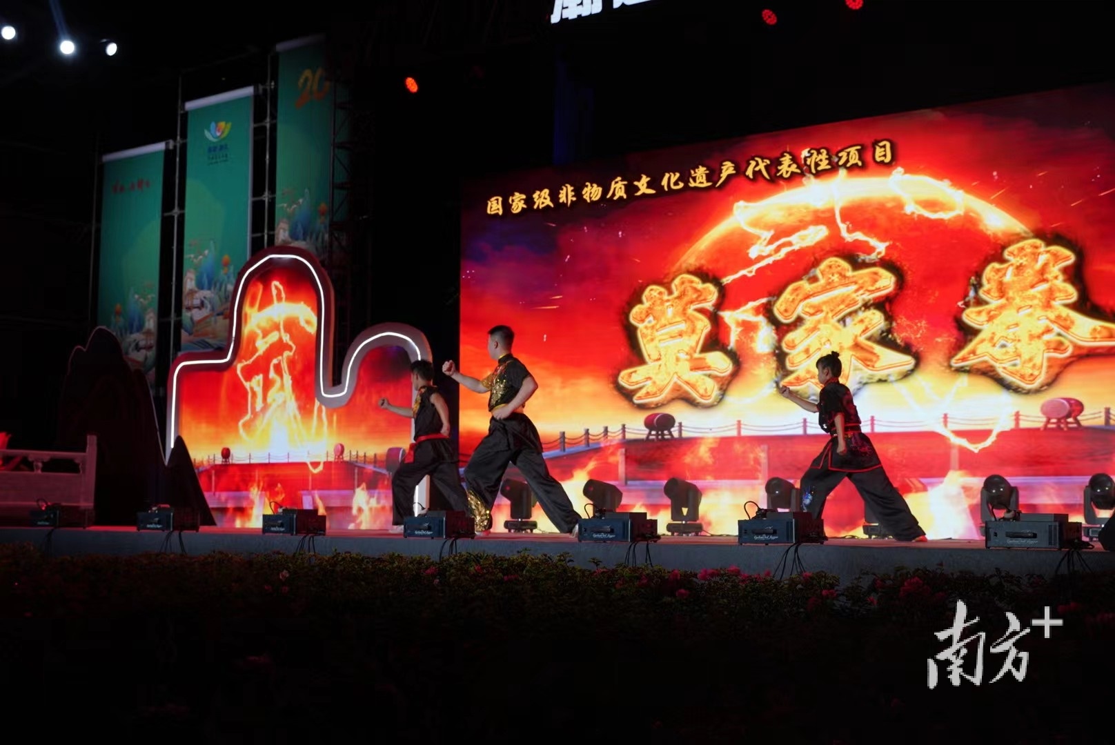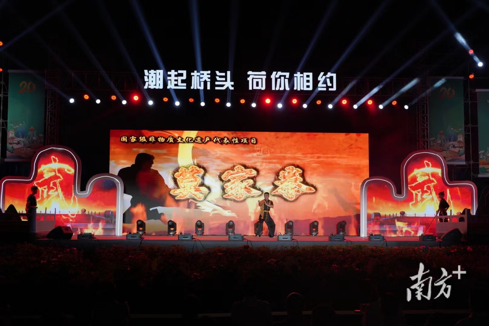 在荷花节启动仪式上,莫家拳微电影首映礼同步启动,现场领导嘉宾和游客观众共同观看了首映。自2021年申报为国家级非遗以来,桥头镇大力推动莫家拳IP产业化,提升莫家拳传播力影响力,实现非遗活态传承。继打造莫家拳形象卡通IP“莫达达”之后,桥头拍摄制作莫家拳微电影,通过丰富的人物形象、感人的故事情节和爱国爱乡的思想主线,彰显莫家拳内在的精神价值和独特的审美价值,向观众展现莫家拳深厚的文化底蕴,进一步探索莫家拳的产业化路径和经济价值。