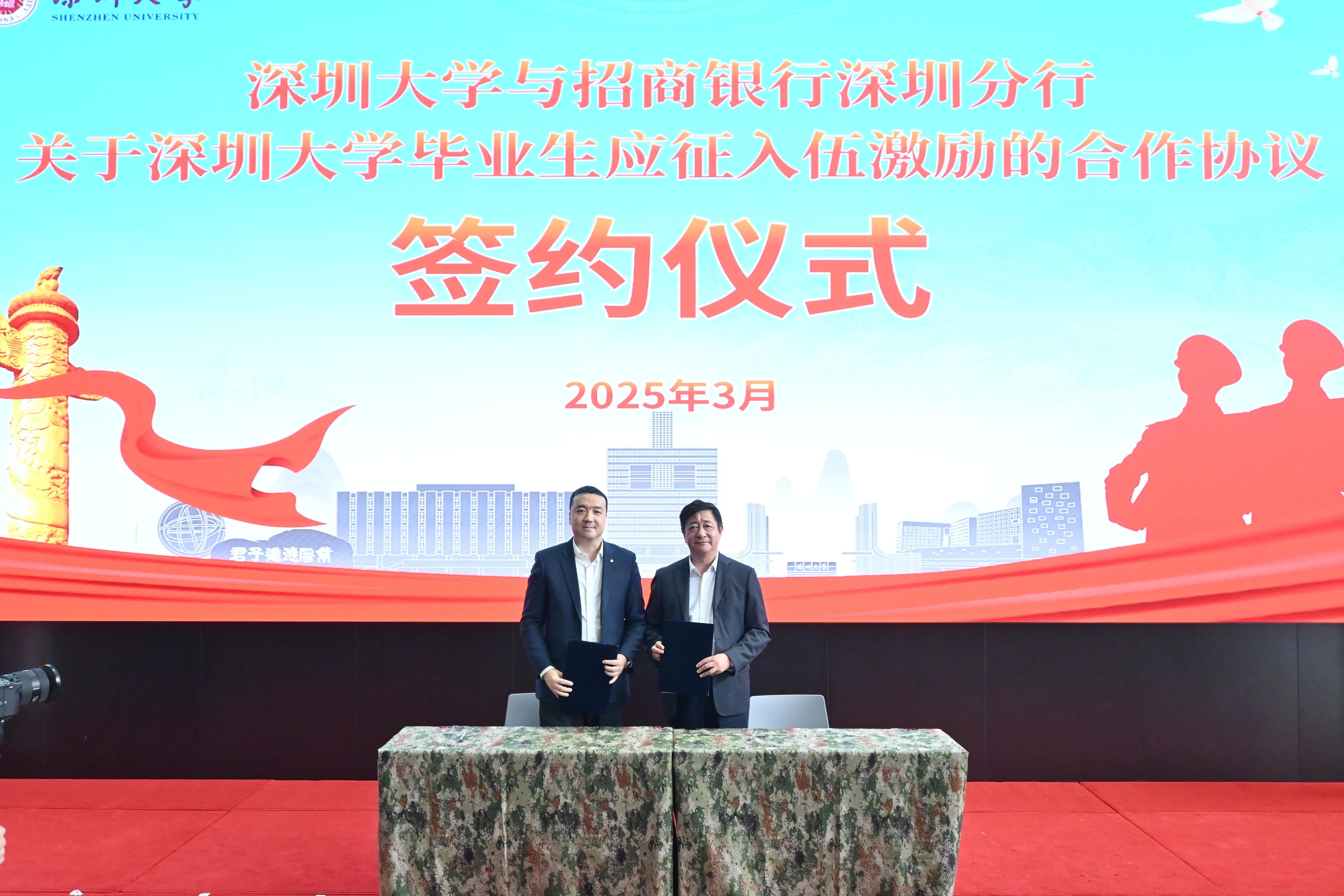 为助力国防教育的高质量发展,招商银行推出“金葵军梦”深圳大学毕业生征兵入伍激励政策。仪式现场,深圳大学与招商银行正式签署《深圳大学与招商银行深圳分行关于深圳大学毕业生应征入伍激励的合作协议》,构建起“先就业再入伍”校企共育新模式。