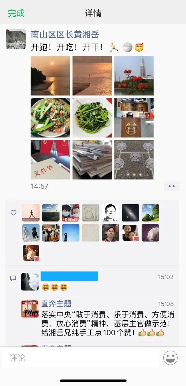 随后,他还发布了一条朋友圈动态。该动态 9 字“带着大家一起 ‘吃、跑、干’” 配 9 图,记录了自己在深圳湾公园跑步,携家人就餐以及办公室加班的流水账。