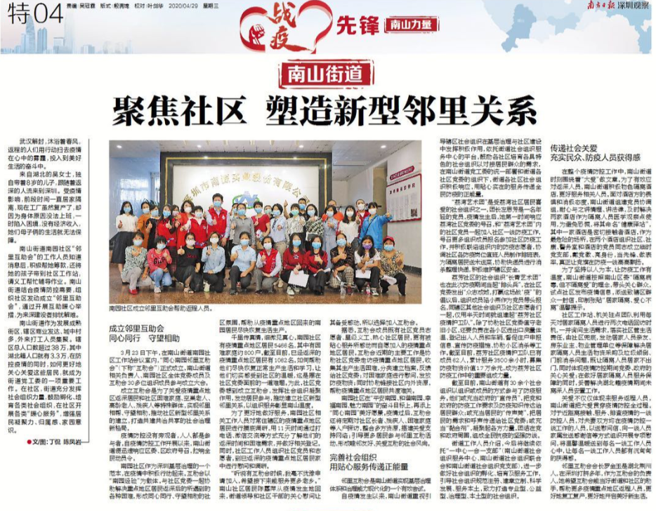 自疫情发生以来,南山街道重视引导辖区社会组织在基层治理与社区建设中发挥积极作用,依托街道社会组织服务中心的平台,鼓励各社区培育各具特色的社会组织以对接居民群众的需求,在南山街道党工委的统一部署和街道各社区党委的组织下,街道各社区社会组织积极响应,用贴心实在的服务传递全民防疫的正能量。