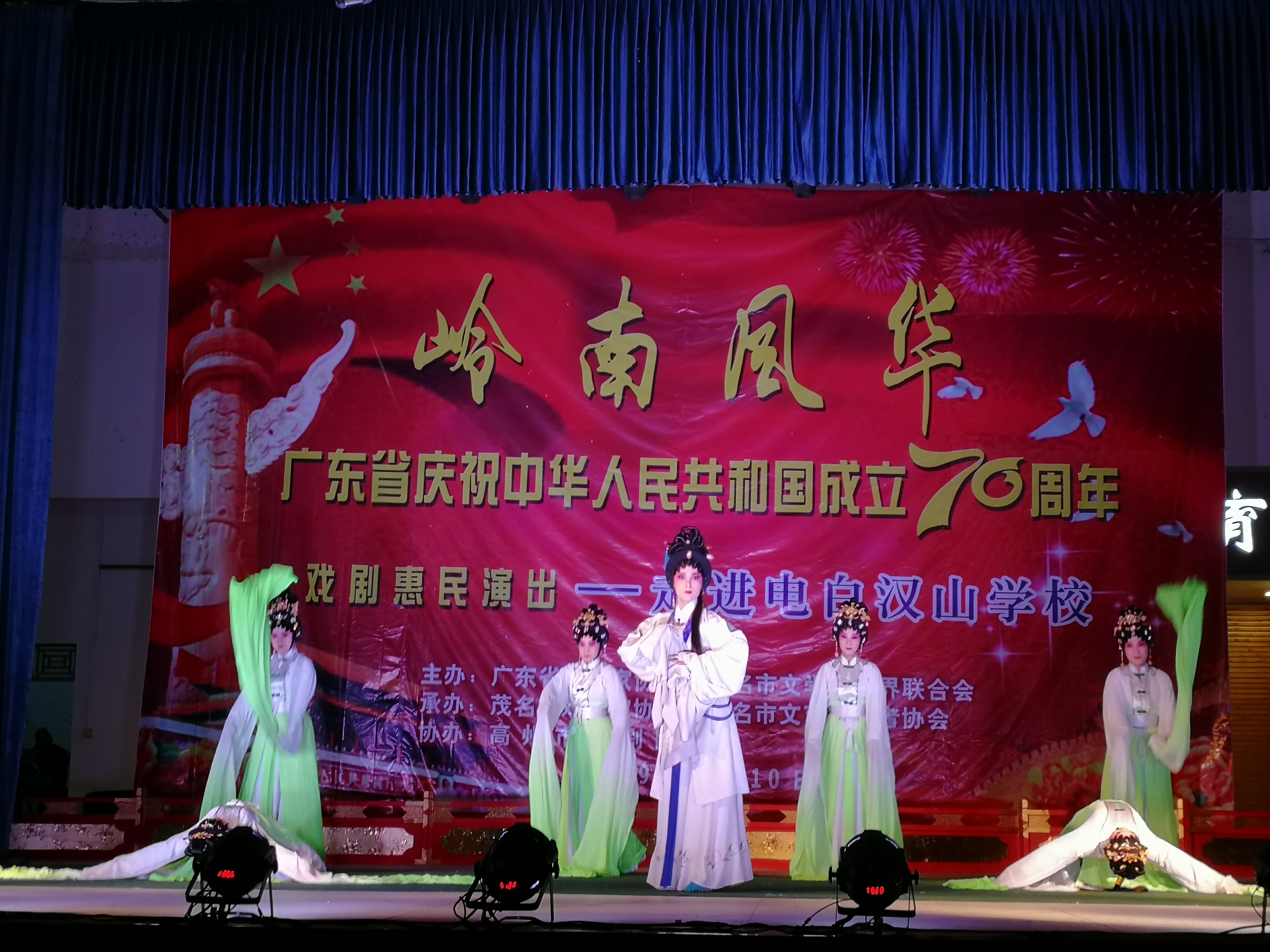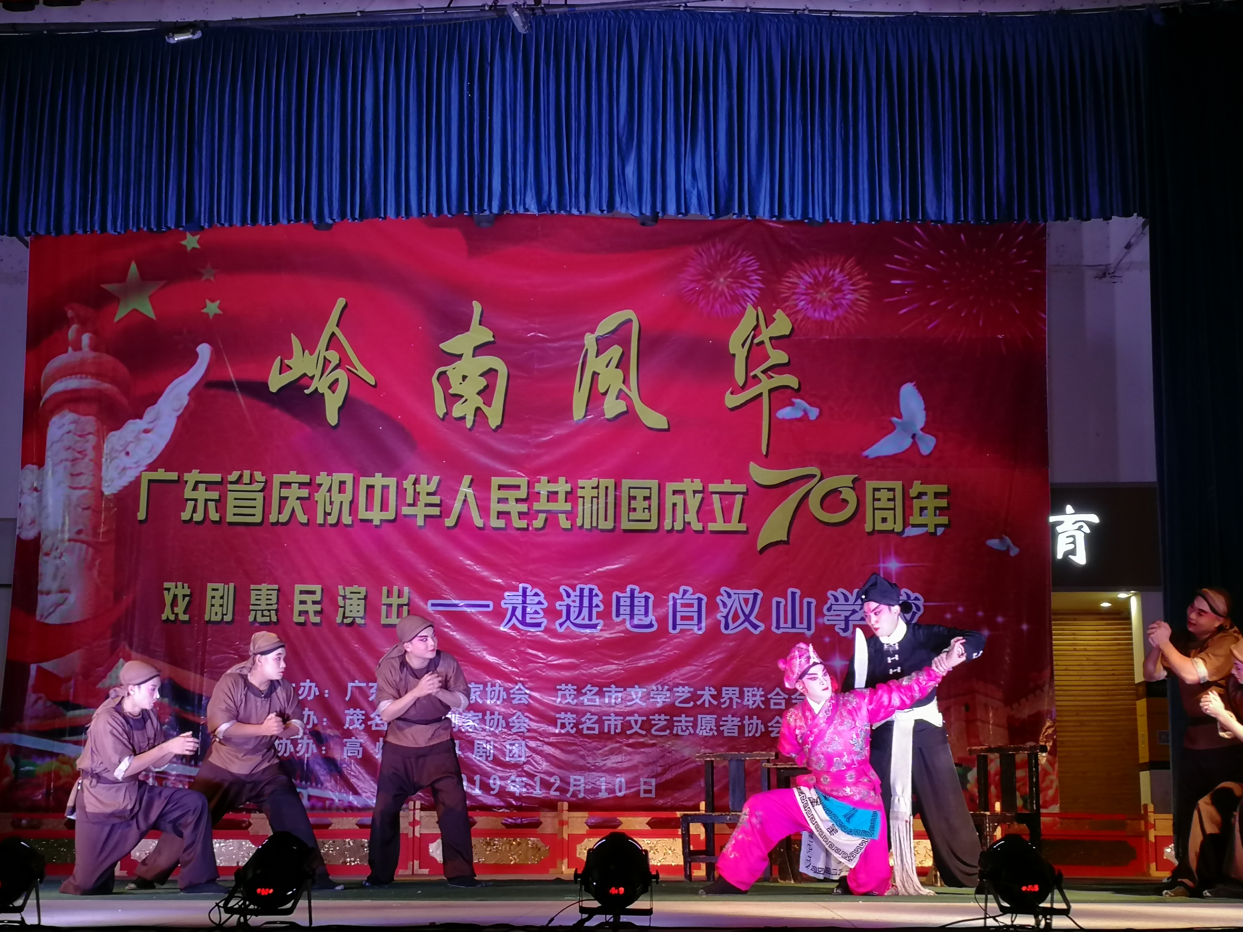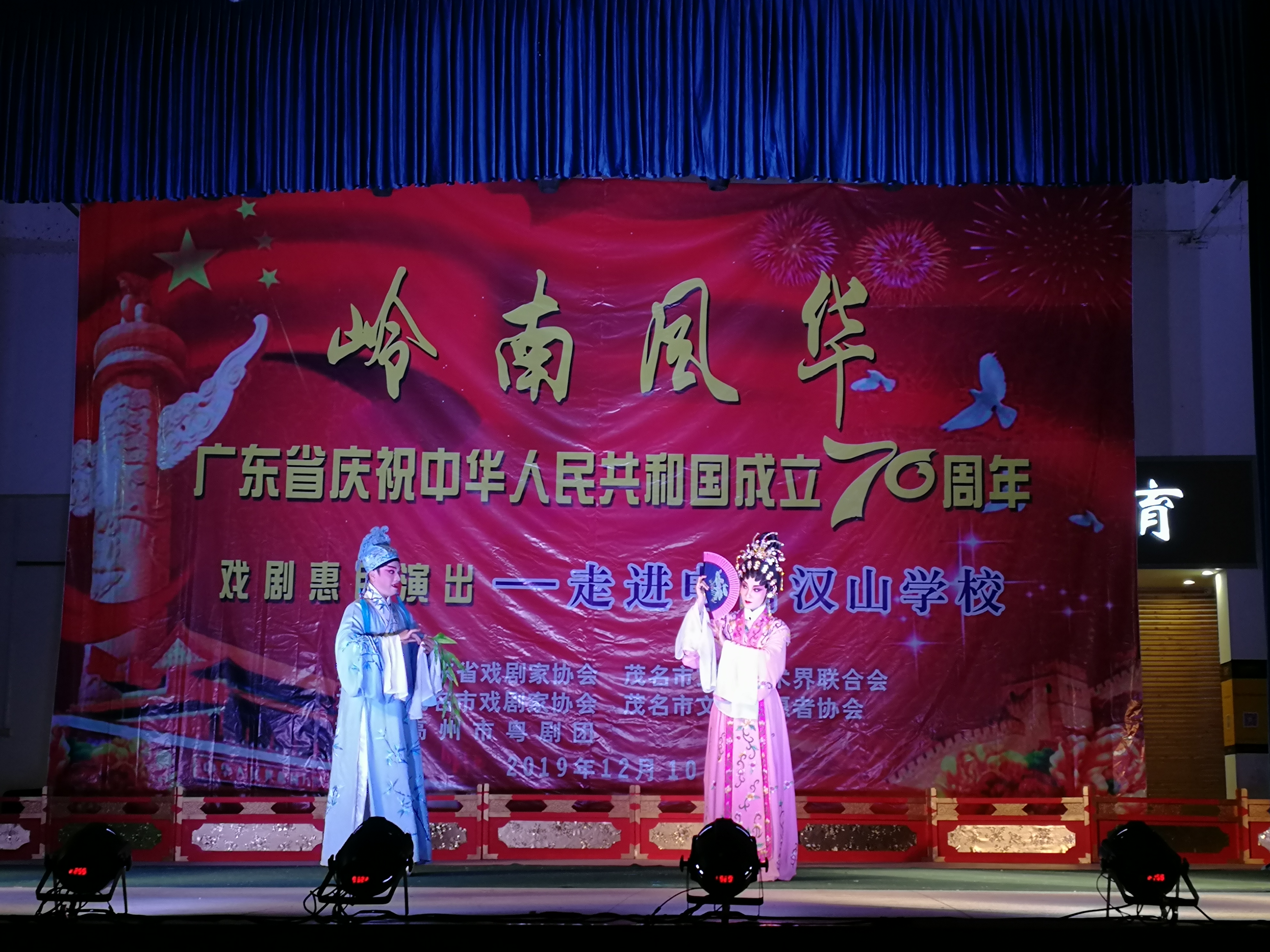 12月10日晚,广东省庆祝中华人民共和国成立七十周年戏剧惠民演出茂名首场文艺晚会在电白区汉山学校举行,3000多名师生兴致勃勃地观看演出。粤剧折子戏、粤剧对唱、京剧表演、现代歌舞异彩纷呈,喜迎2020年元旦节日气氛浓厚。