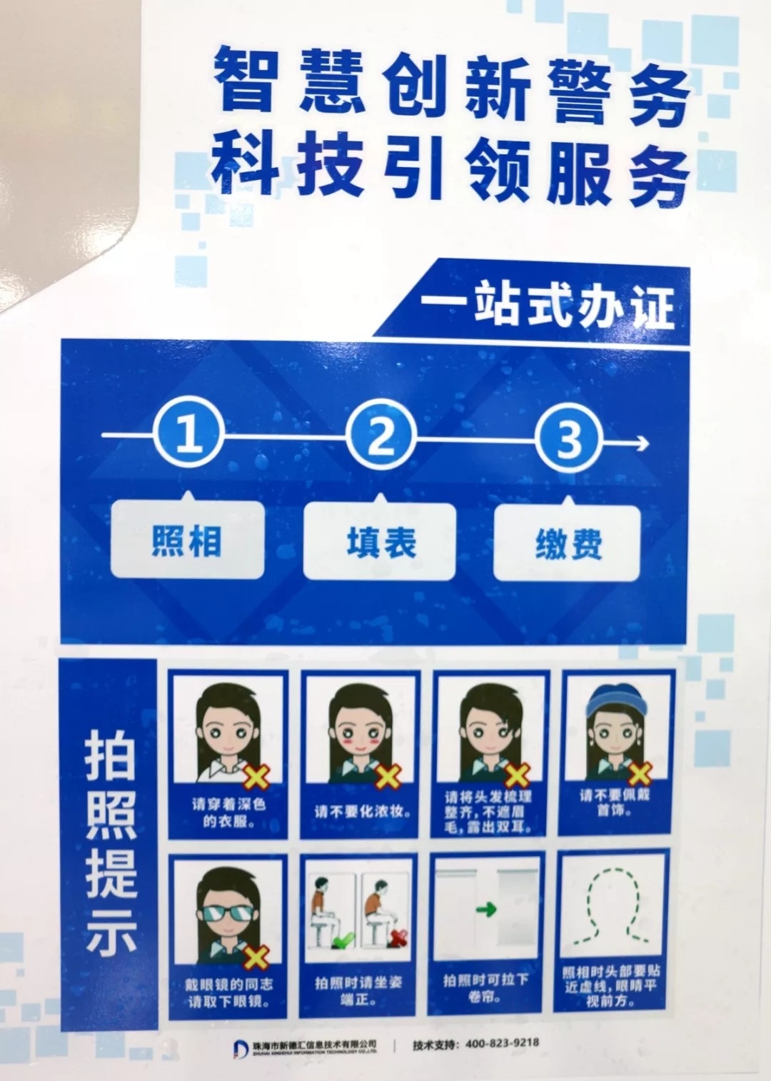 据市公安局出入境管理科负责人介绍,出入境“智慧办证大厅”配备有智慧受理亭4台、自助拍照机1台、智慧导服机1 台,市民可以在大厅内“一站式”完成拍照、填表、缴费、办理等出入境业务,换证、办证整个过程不用10分钟,非常便捷。