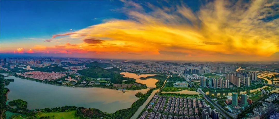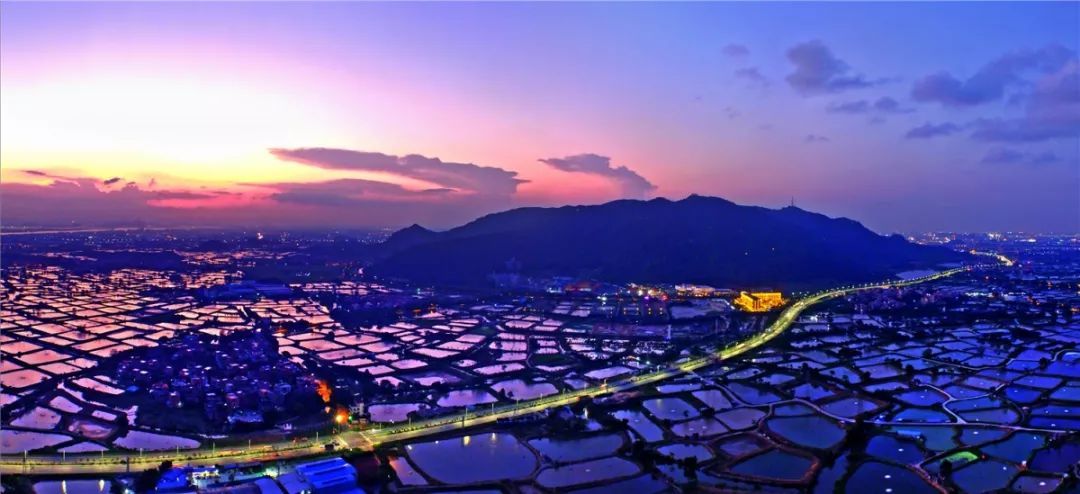 纵横的水网孕育出南海西樵大片的桑基鱼塘,成就了这片“世间少有的美景”。连片的方格鱼塘与西樵山相邻,一山一水相映成趣。从西樵山观景平台俯瞰生态公园,万亩鱼塘水网交织,桑塘连片,与现代化道路一起蜿蜒向前,十分壮美。