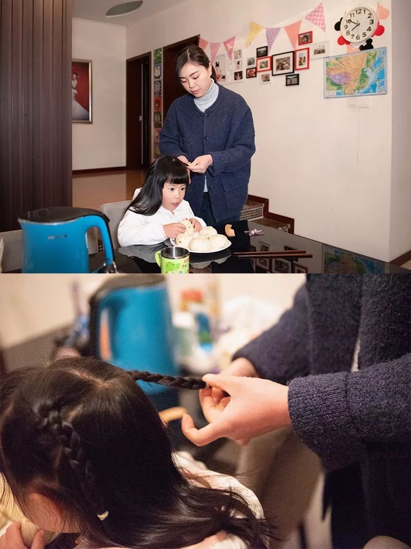 早上8:00,一边陪女儿吃爱心早餐,一边给女儿梳头。