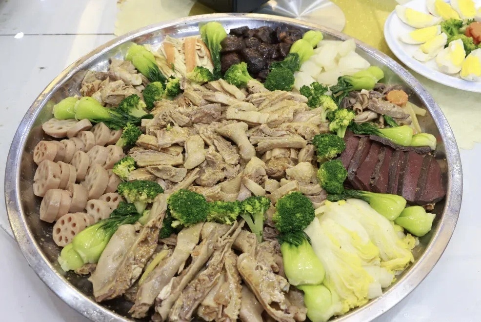 宴席当晚与营养丰富的配菜组成特色美味大盘鹅!其配菜的含义也深有讲究,让我们一一数来:焖冬菇寓意着金银满堂、鹅杂炒西芹寓意着勤劳致富、鲍汁西兰花寓意着幸福健康、鹅汤娃娃菜寓意着福气生财、胡椒萝卜寓意着风调雨顺、高汤莲藕块寓意着吉祥团圆、上汤上海青寓意着平步青云。