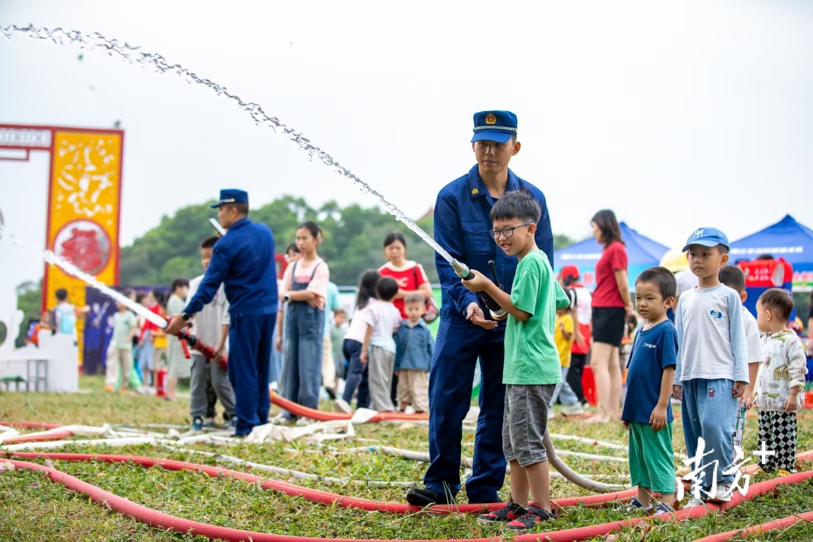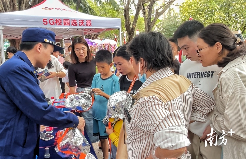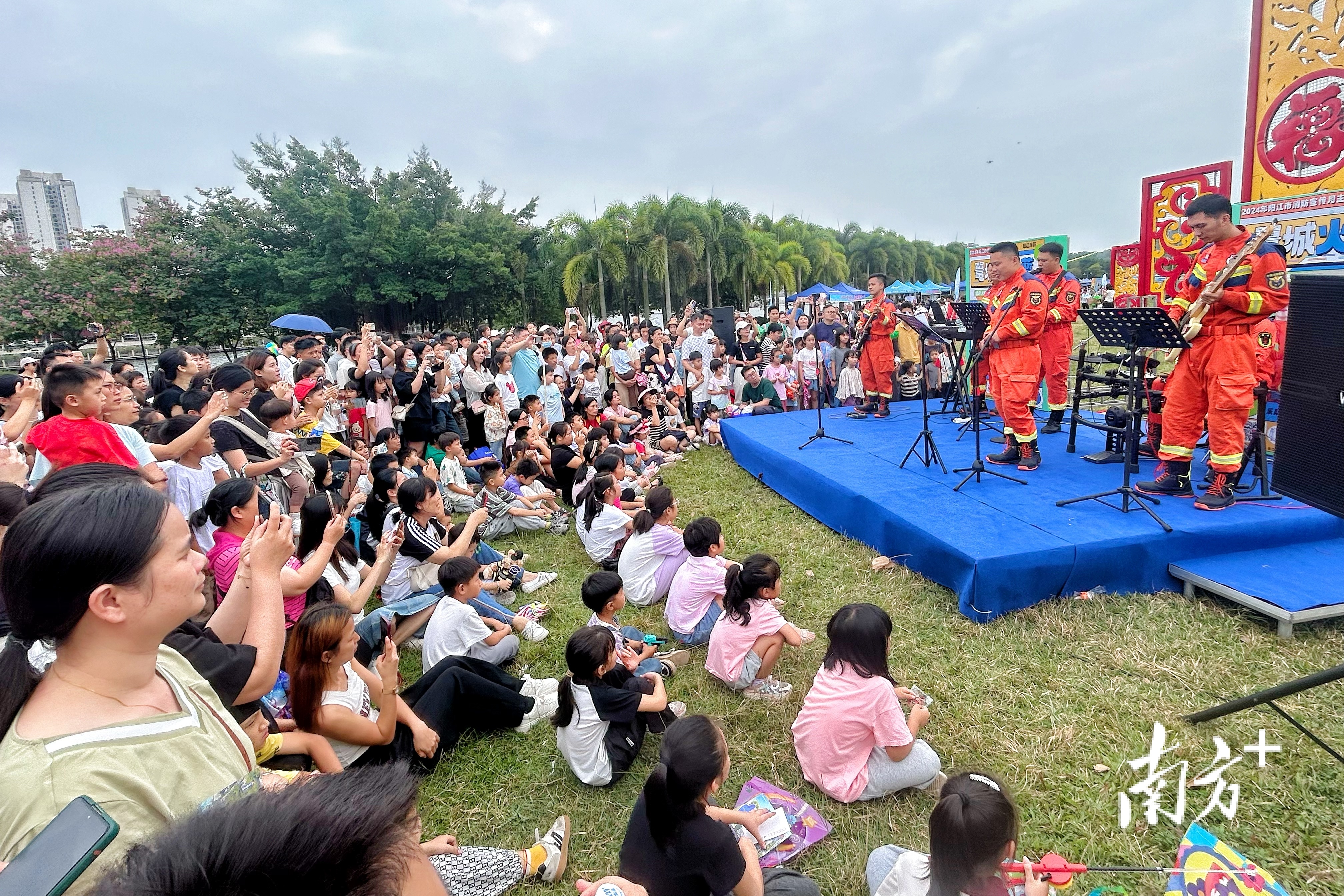 “这是水上机器人,你可以理解为可以遥控的救生圈。”在消防器械展示摊位,消防员热情地讲解着各类消防“救命神器”的用处,雷达生命探测仪、有毒气体探测仪、水下机器人等消防器械与市民零距离接触。在公园的巨型灵芝风筝造型前,“C位”出道的火焰蓝乐队正在台上倾情演唱,舞台围满了一圈圈的大小“粉丝”。消防知识问答区、逃生体验区等区域都排着长长的队伍,参与“打卡”盖章的市民络绎不绝。