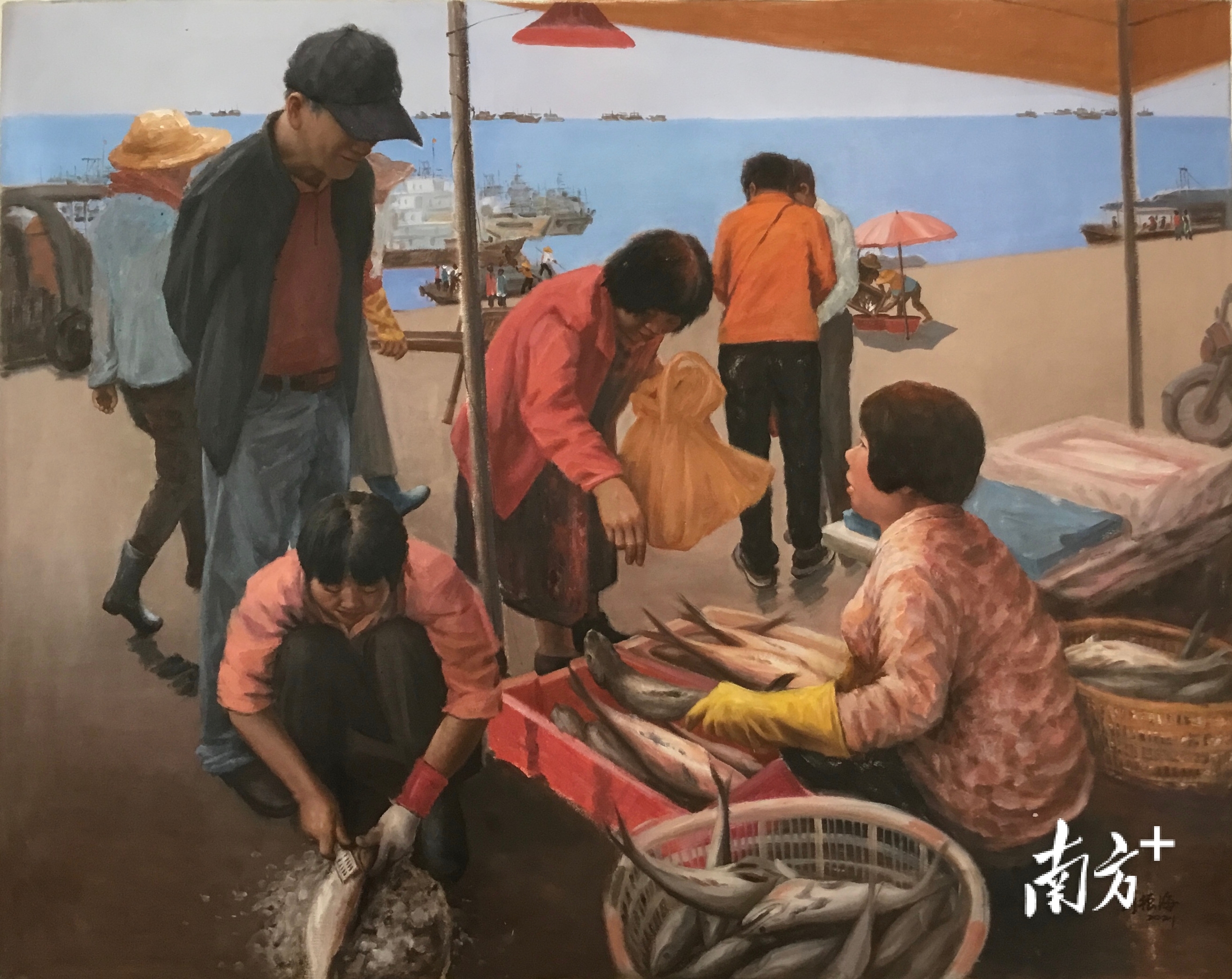 这幅作品是阳西籍画家刘振海创作的油画《渔港的早晨》,画面当中描绘了外地游客在渔船码头选购新鲜海货的场景。作者以细腻的笔触描绘出阳西渔民的日常劳作场景,展现了阳西农文旅产业融合发展的生动画面。