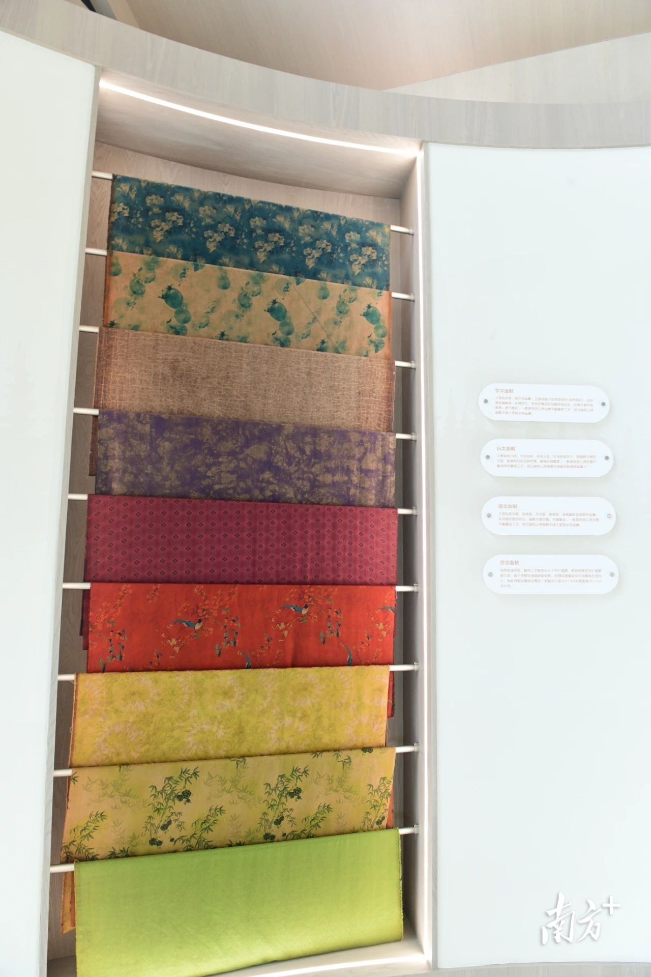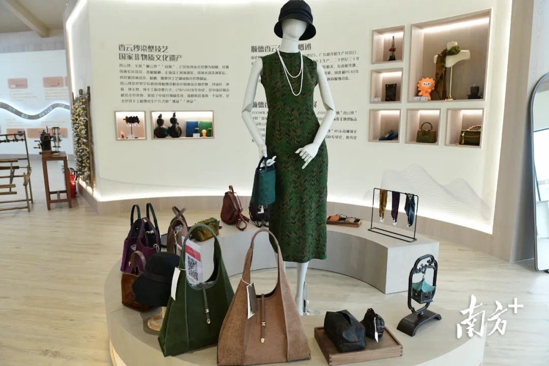 “三洗九蒸十八晒,方得一匹云纱来。”邓金朋表示,这句话说的就是香云纱繁复的制作过程。在蚕桑产业文化园内的香云纱科普馆内,14种工艺、36道工序的图文为游客揭开了非遗的神秘面纱。