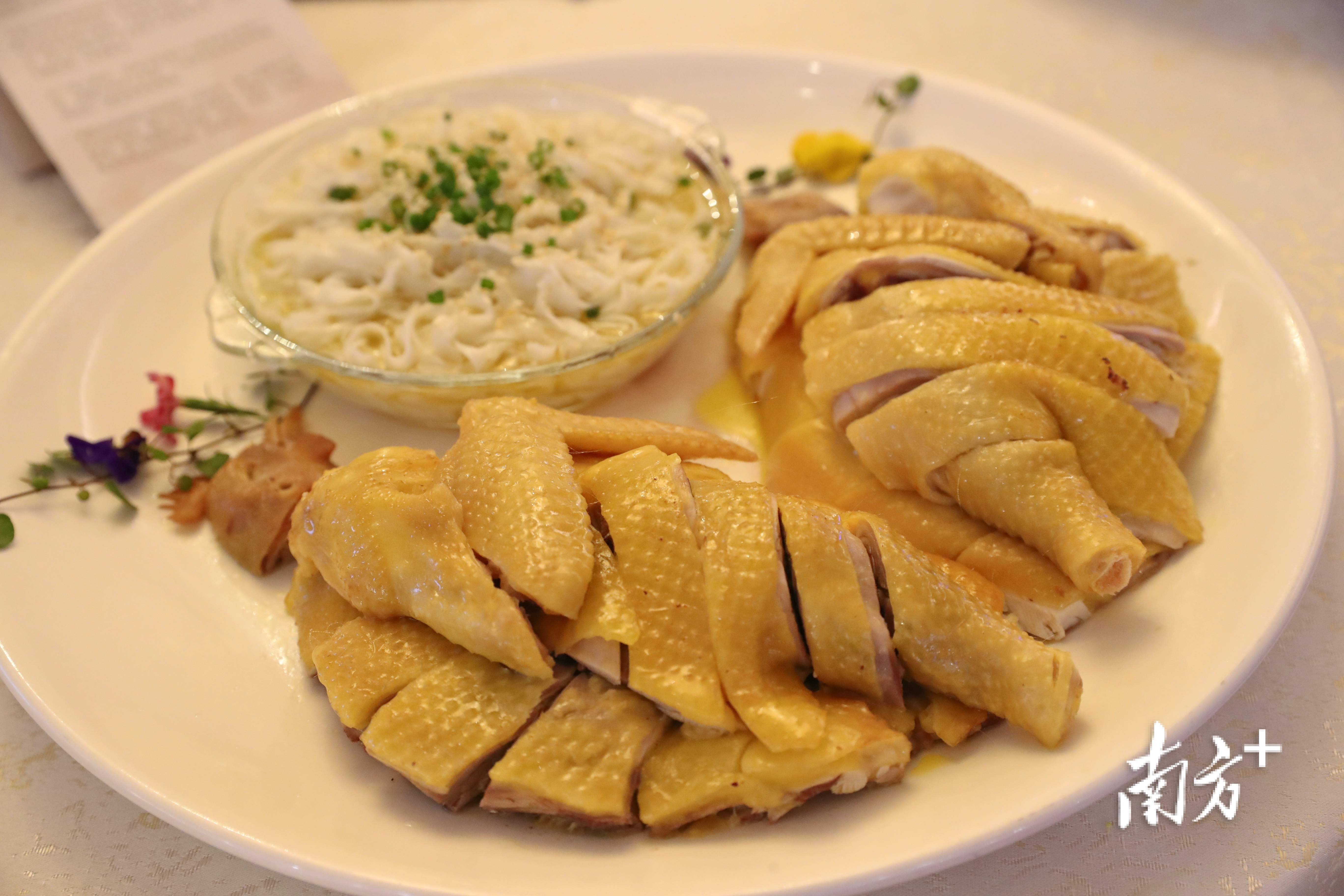 由于鸡太肥美,浸鸡过程渗出大量鸡油在鸡汤上面,需要不时捞去鸡油,于是厨师利用这些鸡油创出另一道美食鸡油捞粉。