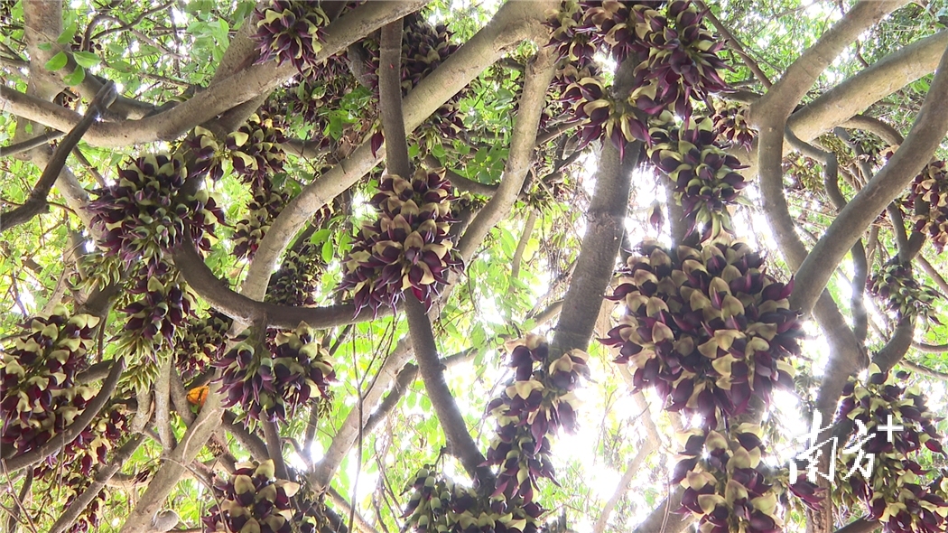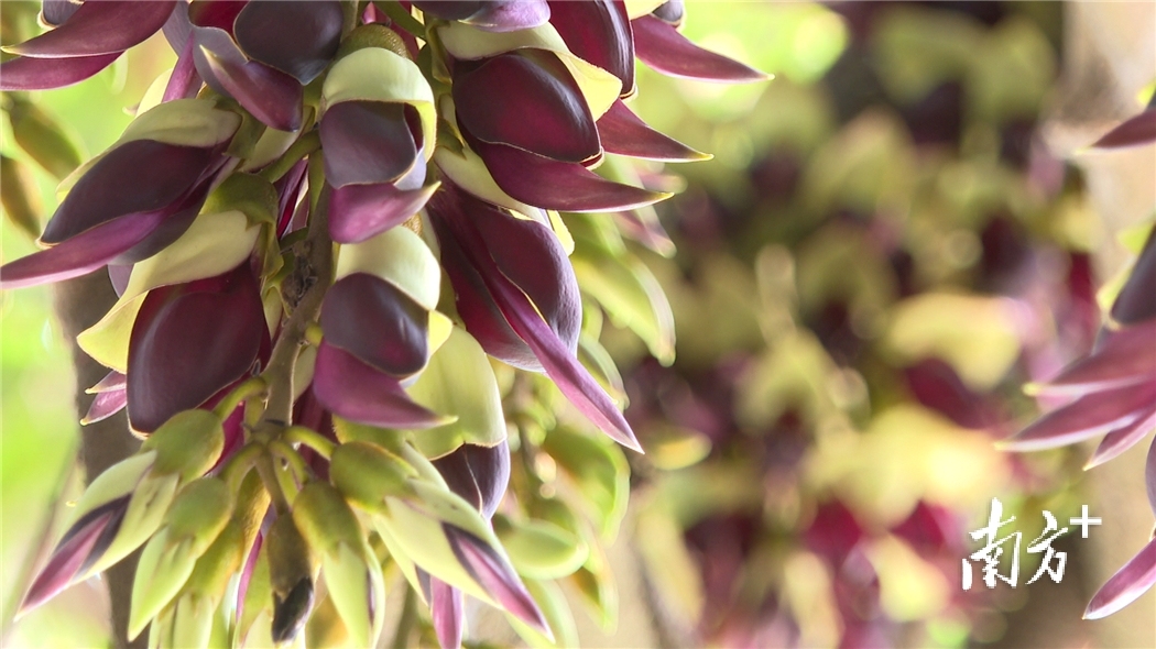 远远望去,古树上一朵朵禾雀花绽放着,繁茂的藤蔓上挂满了密密麻麻的花朵,吊挂成串、千姿百态,犹如一群禾雀藏身在花藤中,正是“藤缠树兮花似雀”的真实写照。走近细赏,每一朵禾雀花都宛如一件精美的艺术品,“头、嘴、翼、尾”俱全,形神兼备,盛开者如振翅欲飞,含苞者则如雏鸟待哺,十分有趣。