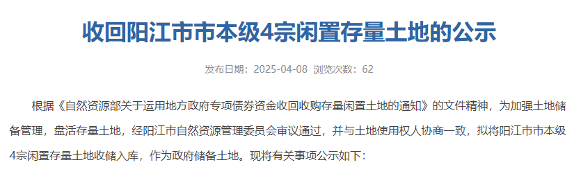 今年2月12日,阳江也曾发布拟收回的闲置存量土地有3宗,总用地面积超12万平方米,收回价格约3.18亿元。