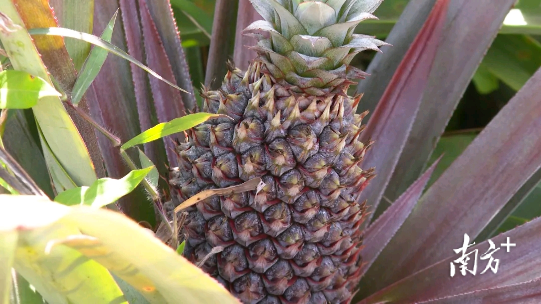 走进种植基地,凤梨长势十分好,一颗颗个头饱满的凤梨“端坐”在丛丛叶片中心,工人们正在进行除草工作。