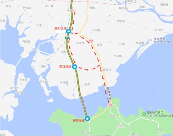 海陵岛方向:车辆可提前在高新区站或阳江港站驶离高速公路,行驶G234国道前往目的地。