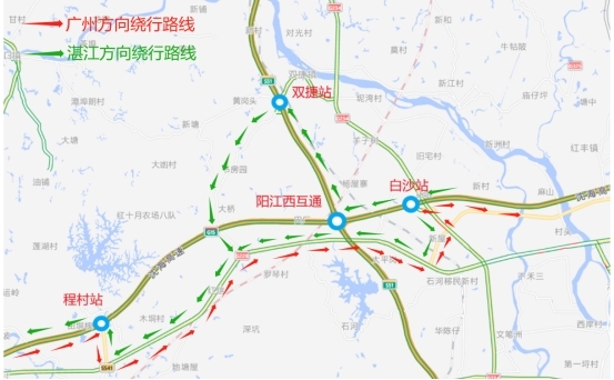 1.湛江方向:车辆可提前在白沙站驶离高速公路,行驶地方路至程村站重新进入高速公路;或在阳江西互通转阳阳高速行驶,在双捷站驶离高速公路,行驶地方路至程村站重新进入高速公路。