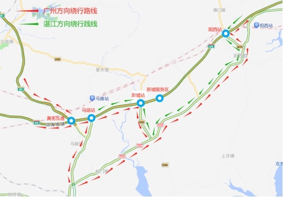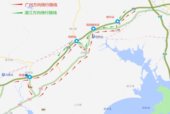 1.湛江方向:车辆可提前在阳西站驶离高速公路,行驶地方路至新墟站重新进入高速公路。