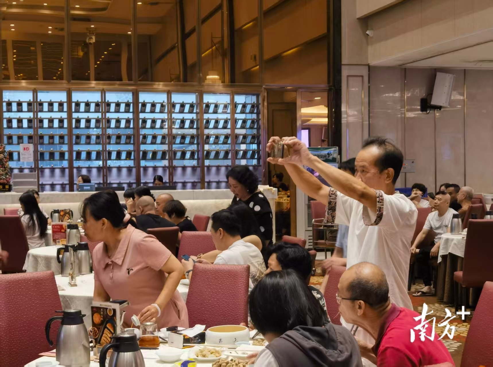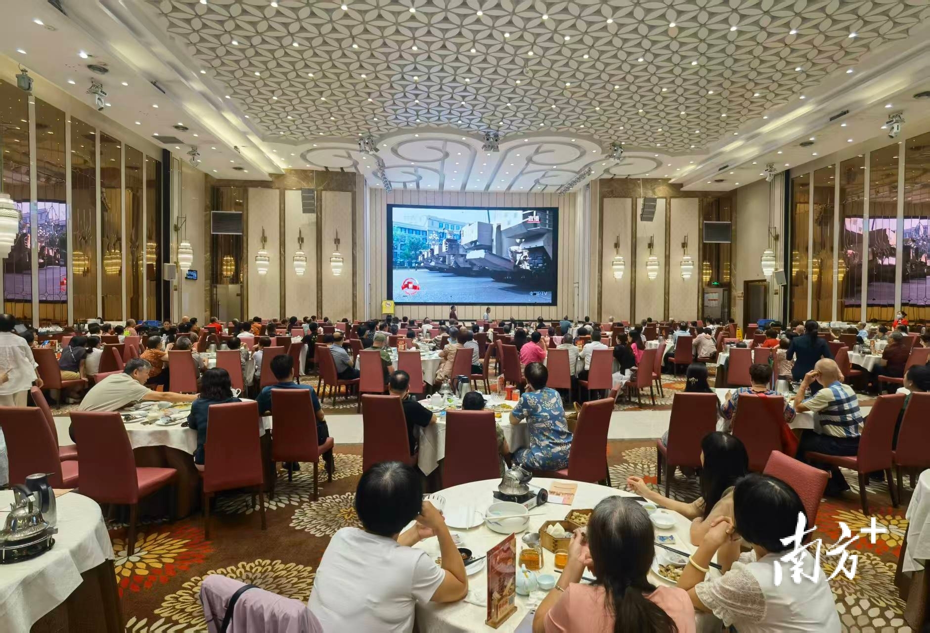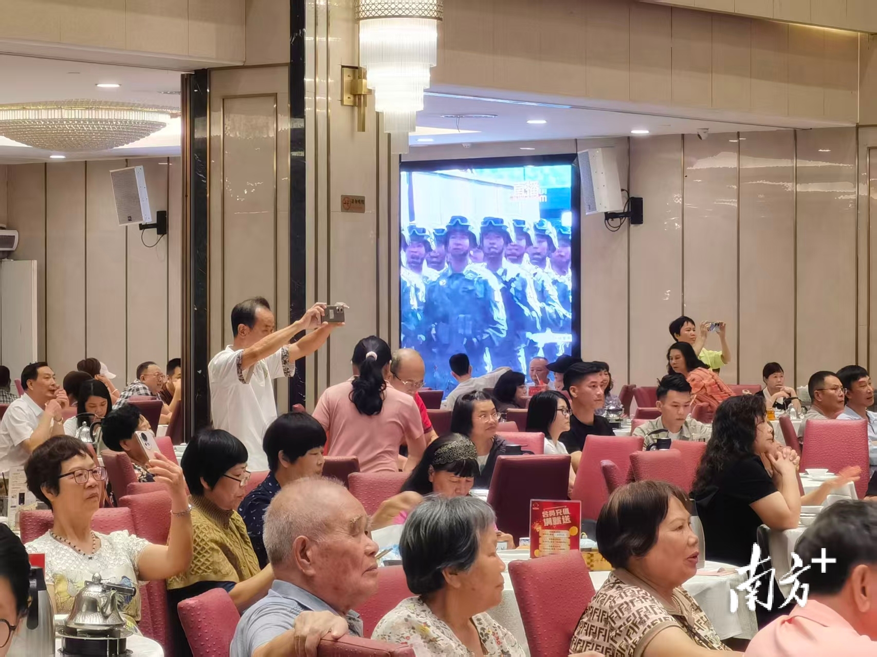 当天上午9时许,在阳江市江城区东风三路某茶楼,尽管大厅内座无虚席,却没有往日的嘈杂。一张张圆桌前,亲朋好友围坐在一起,目光齐齐投向大厅中央的大屏幕上,就连桌上茶点放凉了也还未动筷。