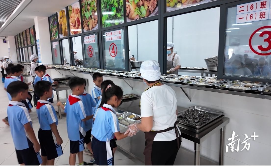 校园餐的温度不仅体现在菜品多样性上,更蕴含于日常细节之中。“还有10分钟就要放学了,先把汤盛出来。”笔者注意到,在华师阳东附小食堂里,学生来就餐之前,苑丽红就细心叮嘱工作人员提前盛汤,避免学生喝的时候烫嘴。这样的温情服务已成为该校食堂的日常:取餐窗口处,工作人员轻声提醒“小心烫口”;陪餐老师悉心照顾低年级学生用餐;坚持每周为学生提供应季水果和养生糖水……通过科学配餐+人文关怀,学生用餐体验得到全面提升。