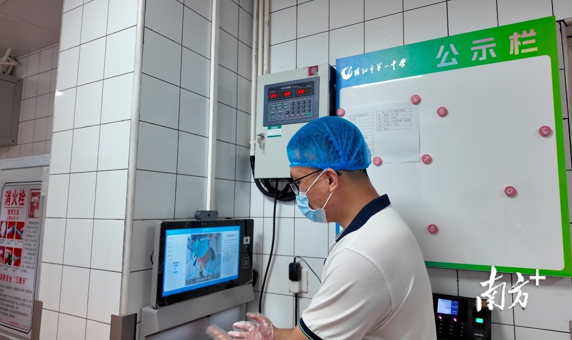据介绍,阳江一中食堂的工作人员在进入食堂前,都要在晨检区进行检查。笔者看到,工作人员站在智能晨检设备前,经过人脸识别确定身份后,便依次进行测温、双手正反面拍照等流程。