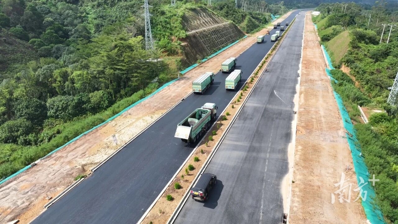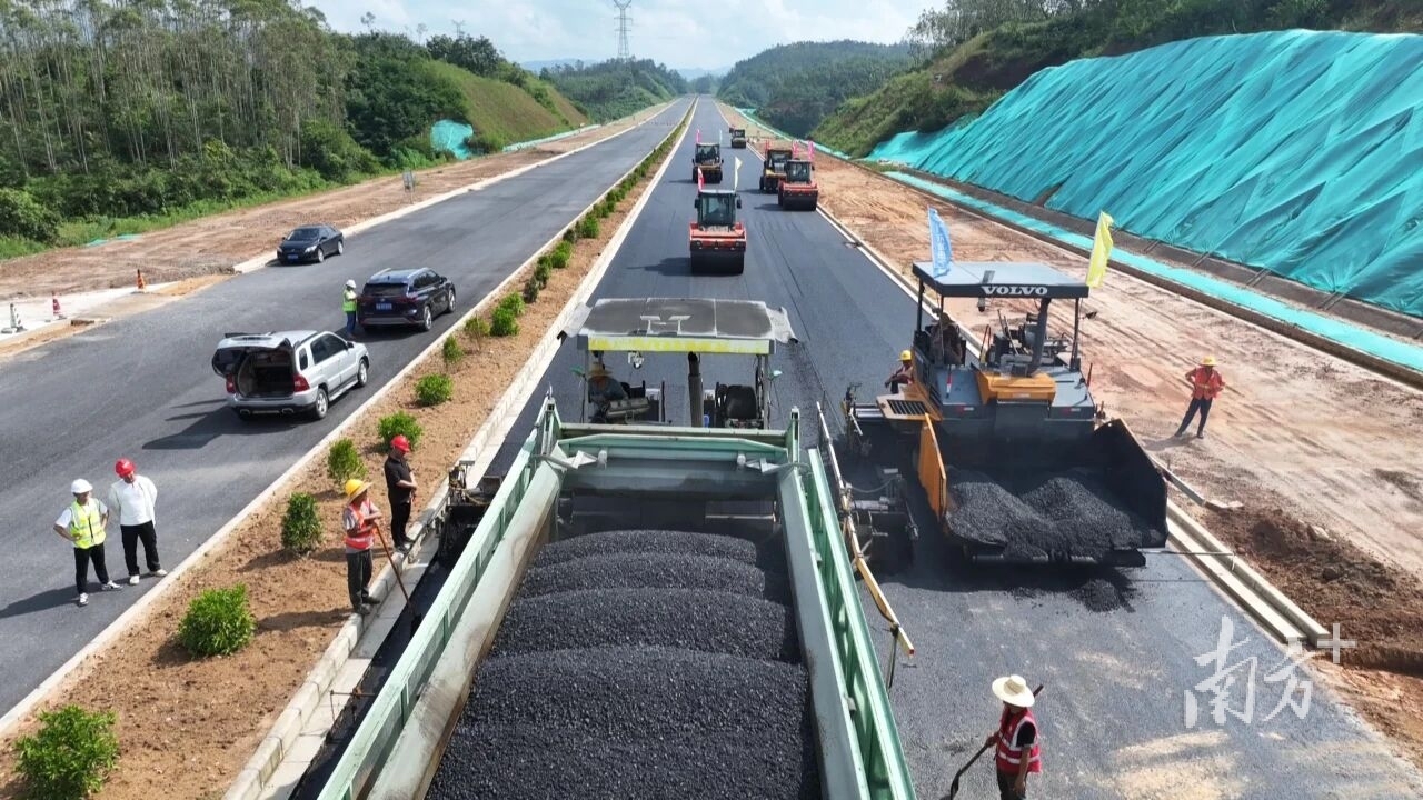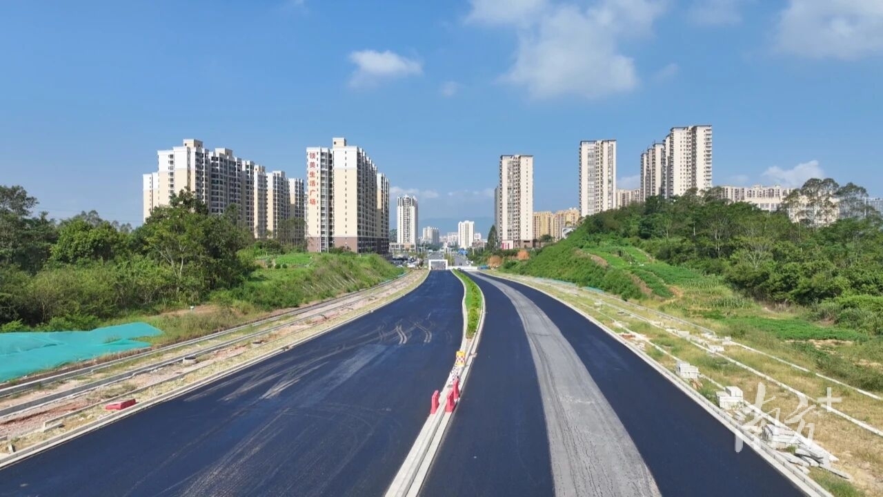 “截至10月9日,进站路路基填方346万方,挖方372万方,全线路基填挖已完成,目前正在进行碎石垫层、水稳基层及沥青面层的施工。”广东省建筑工程集团股份有限公司项目部工程管理部部长胡良彬介绍,这条路是按一级公路兼城市道路设计的。其中,前3km设计的时速是60km,后7km时速是80km,双向6车道。目前项目总体完成率约90%,计划在2025年11月底完工。