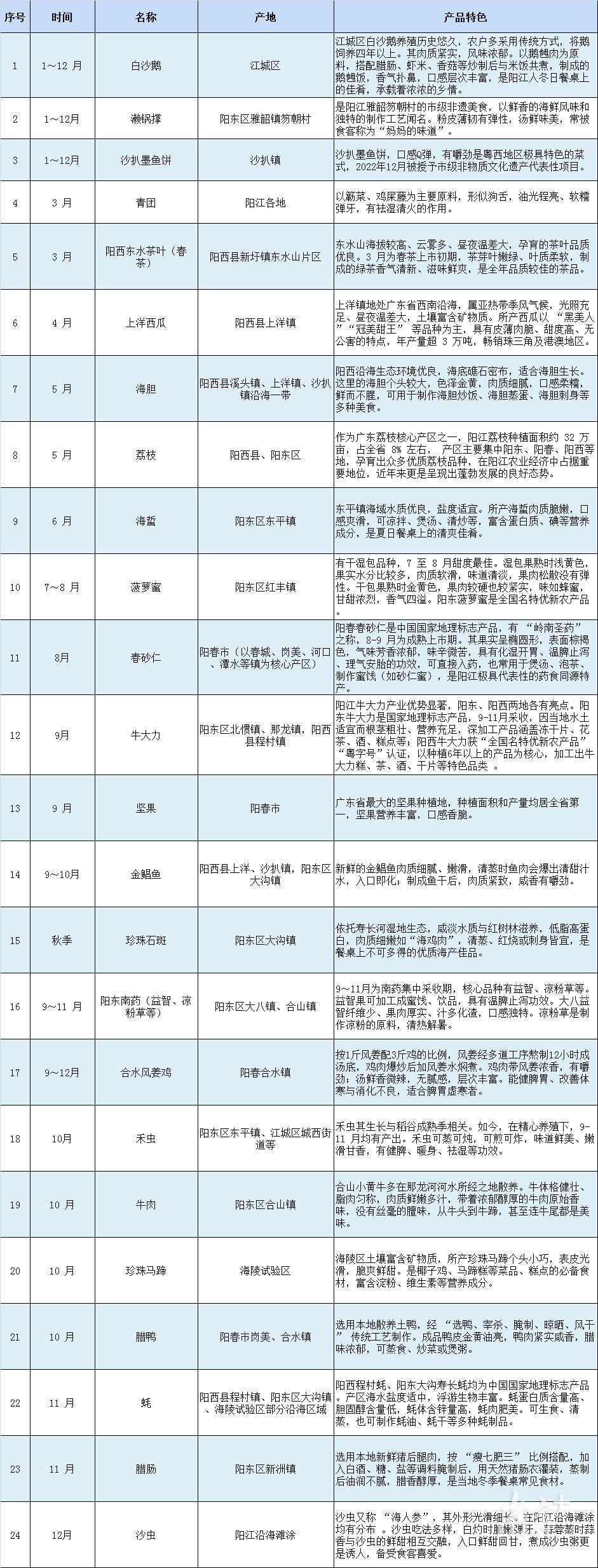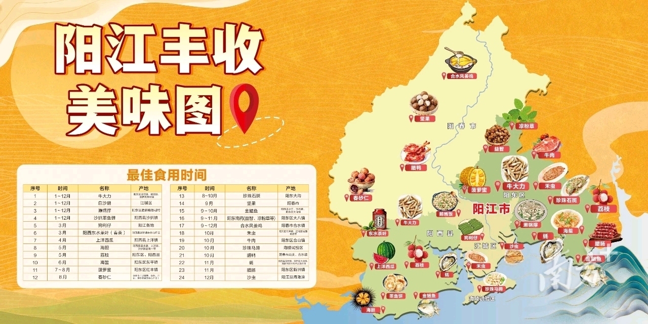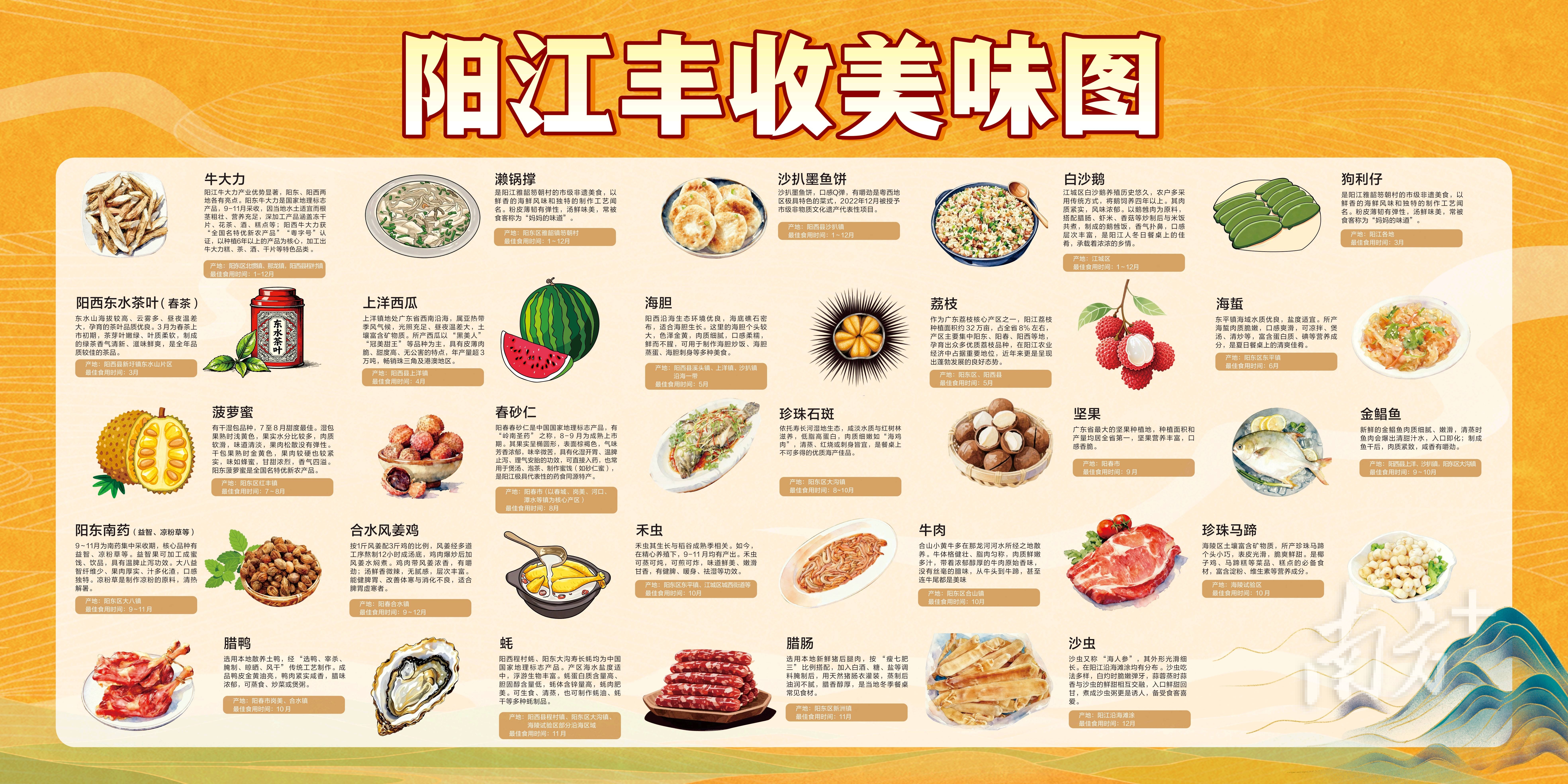 还在问来阳江有什么好吃的?别问啦,跟着这张地图在阳江吃遍四季、吃遍全城!10月15日,阳江市庆祝2025年中国农民丰收节活动开幕,现场发布了汇聚全市优质农产品和特色美食的“丰收美味图”。该图整合了阳江全市特色农产品+地道美食,并按时间轴梳理了什么季节吃什么,去哪吃,轻松解锁了阳江特色时令之味。