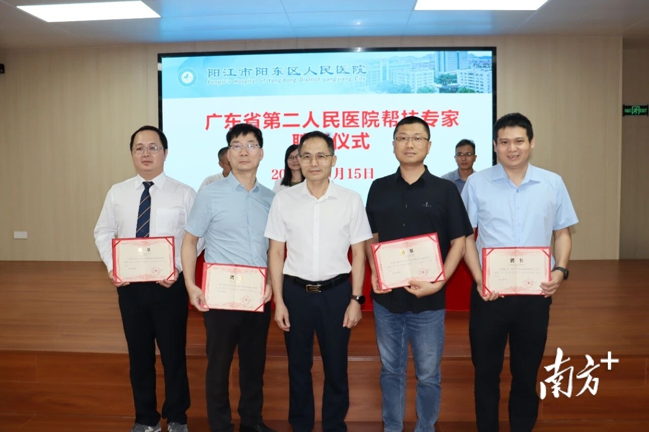 人才链在推动创新和发展中起着核心作用,阳东区推动紧密型医联体的目标之一,便是加强区域医疗人才梯队建设。“我们希望借由医联体这一载体,在省二医的助力下,一方面全面提升我院现有人才的业务能力;另一方面通过省二医提供的优质平台,吸引更多的高层次人才,在5年内培养出一批学科带头人,打造一支高、中、初级职称结构合理、配置完善的人才队伍。”阳东区人民医院党委书记利小春介绍,为加强人才梯队建设,具体合作中,省二医协调派出相关学科专家常驻省二医阳江医院,参与具体的诊疗、带教工作,进行短期动态帮扶,上述5位以及近日又增加了1位受聘对象则为首批派驻专家。