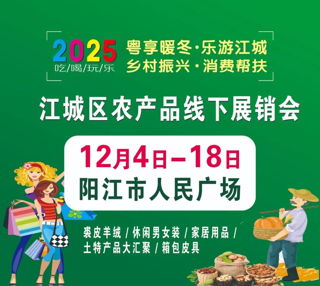 12月4日至18日,阳江市“粤享暖冬 乐游江城”促消费活动暨“乡村振兴•消费帮扶”农产品线下展销会将在阳江市人民广场启幕。