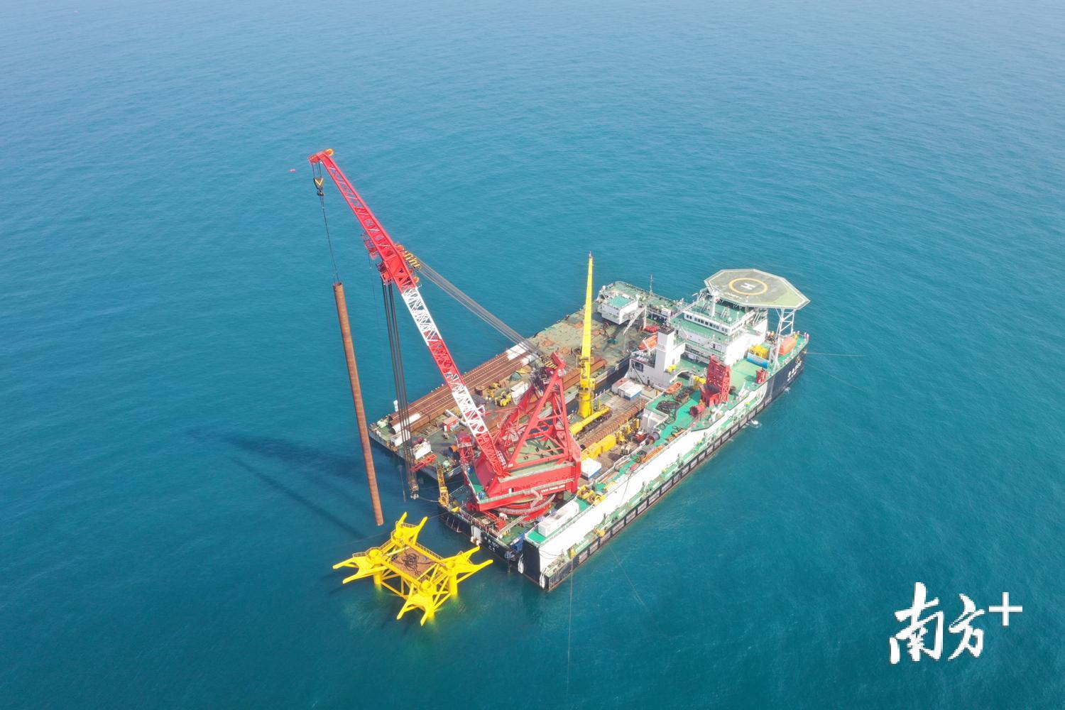 ▼华西900施工船正在将辅助桩插到导向架上,之后会将辅助桩打入泥底下。